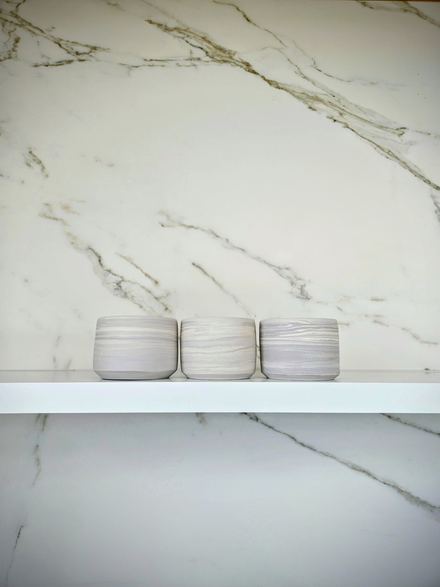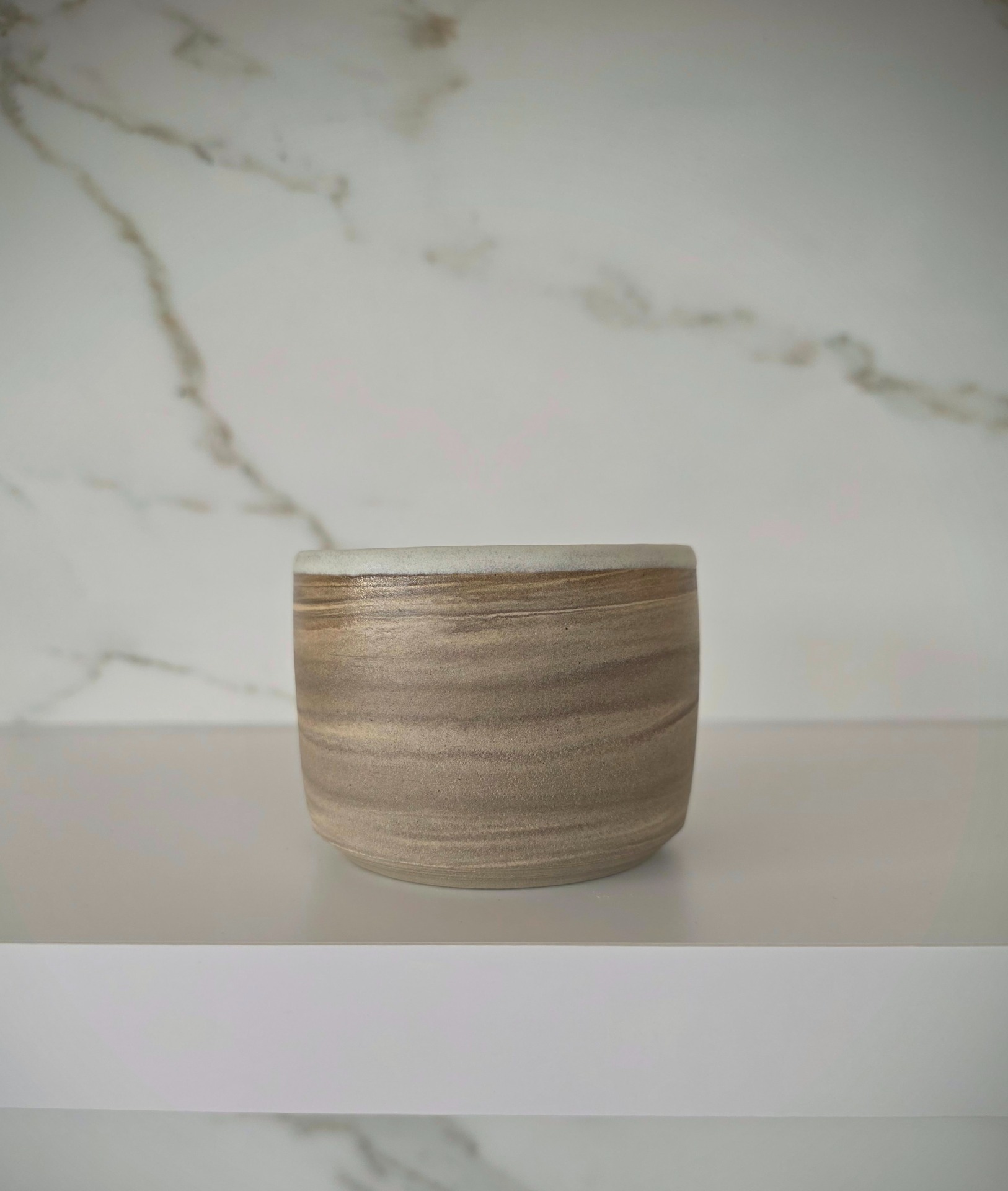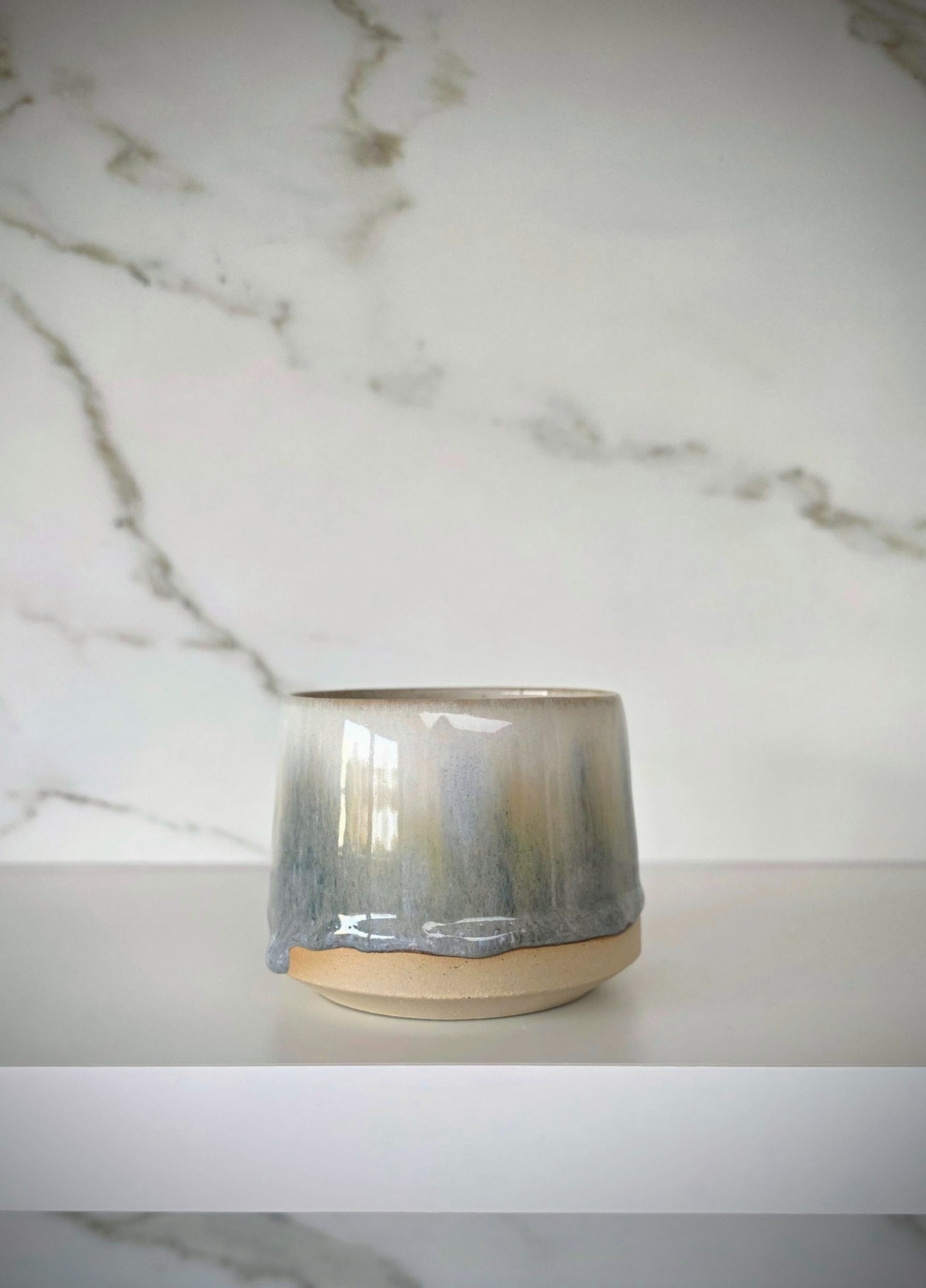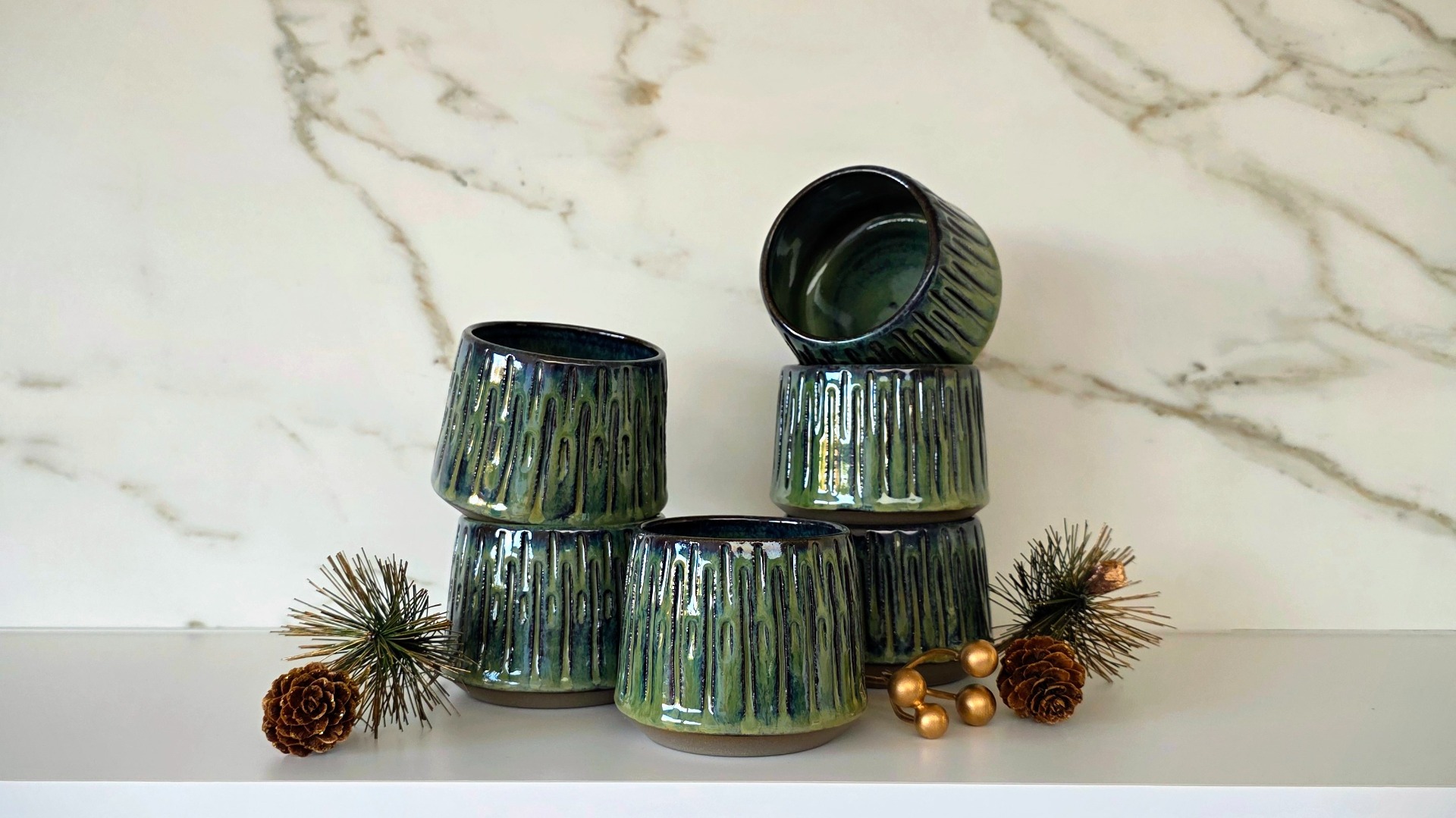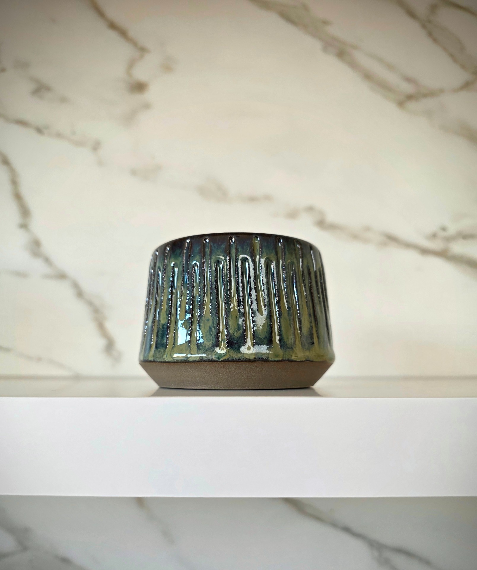 Gekerfde keramische koffietas, waarbij de kervingen doorlopen, gemaakt van antracietbakkende klei en afgewerkt met een blauwgroene glazuurcombinatie. Elk stuk is uniek en op de draaischijf gemaakt, kleur en afmetingen kunnen dus licht afwijkend zijn. Inhoud: ± 200mL