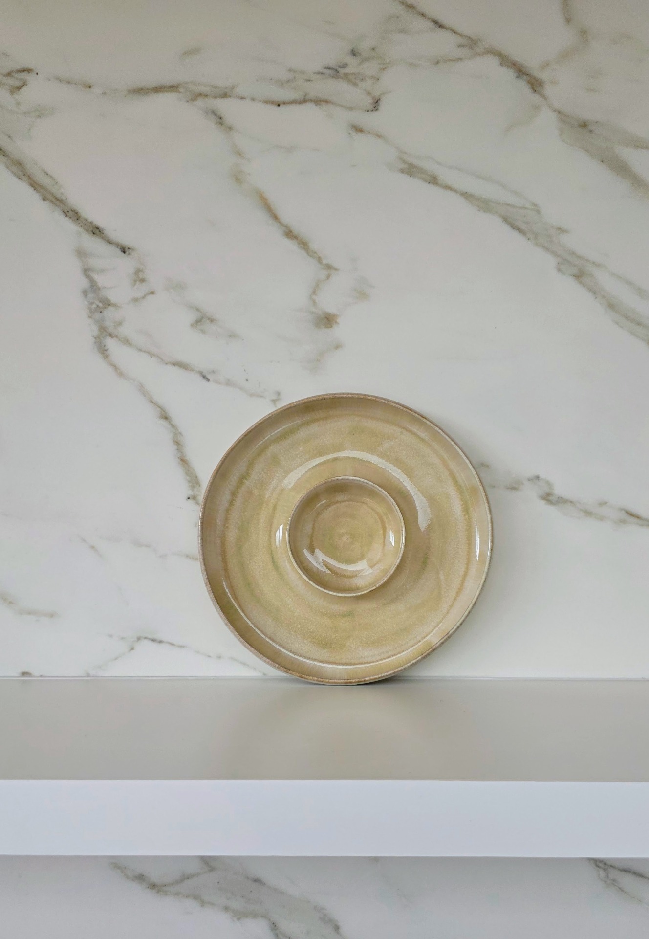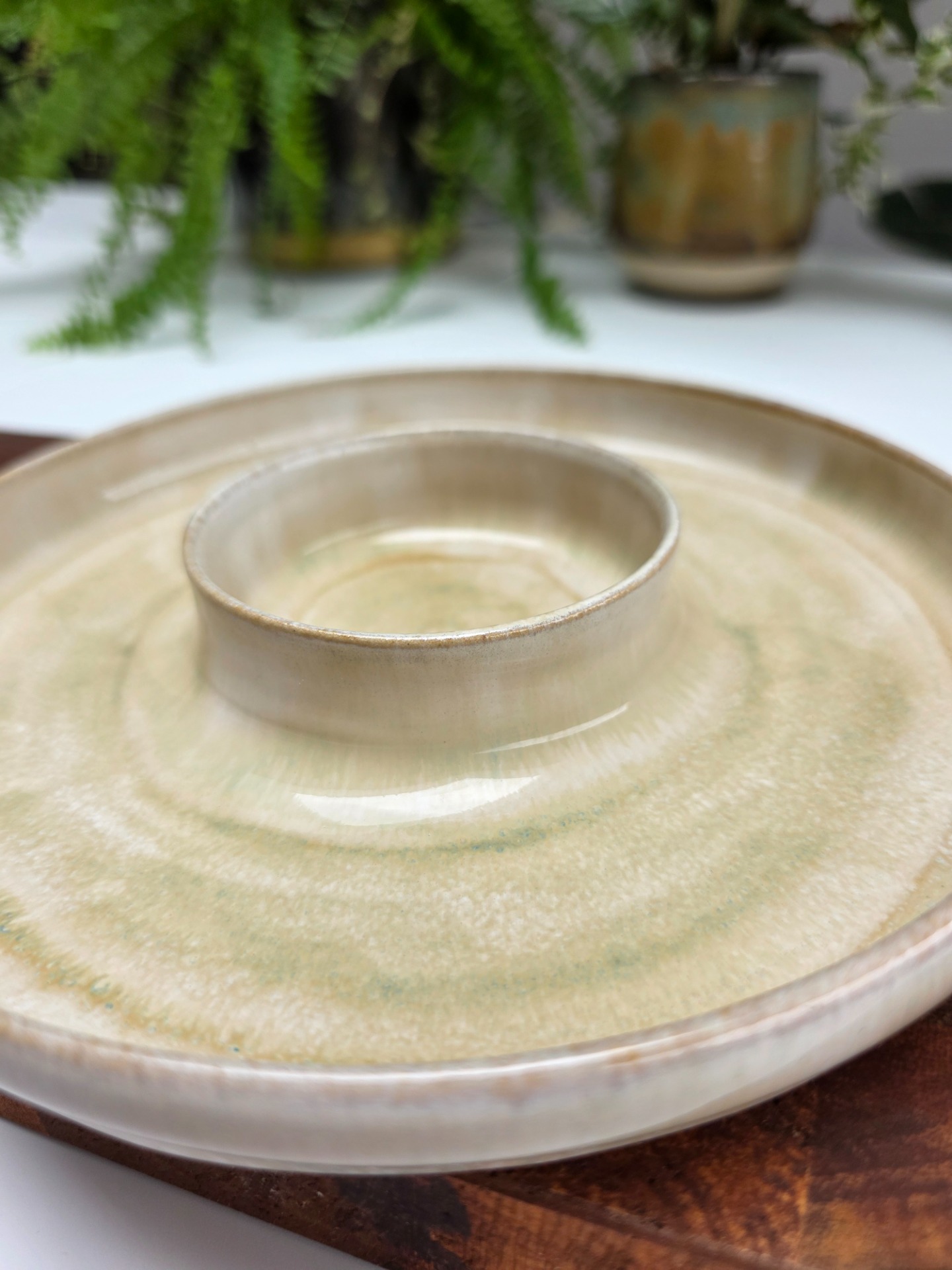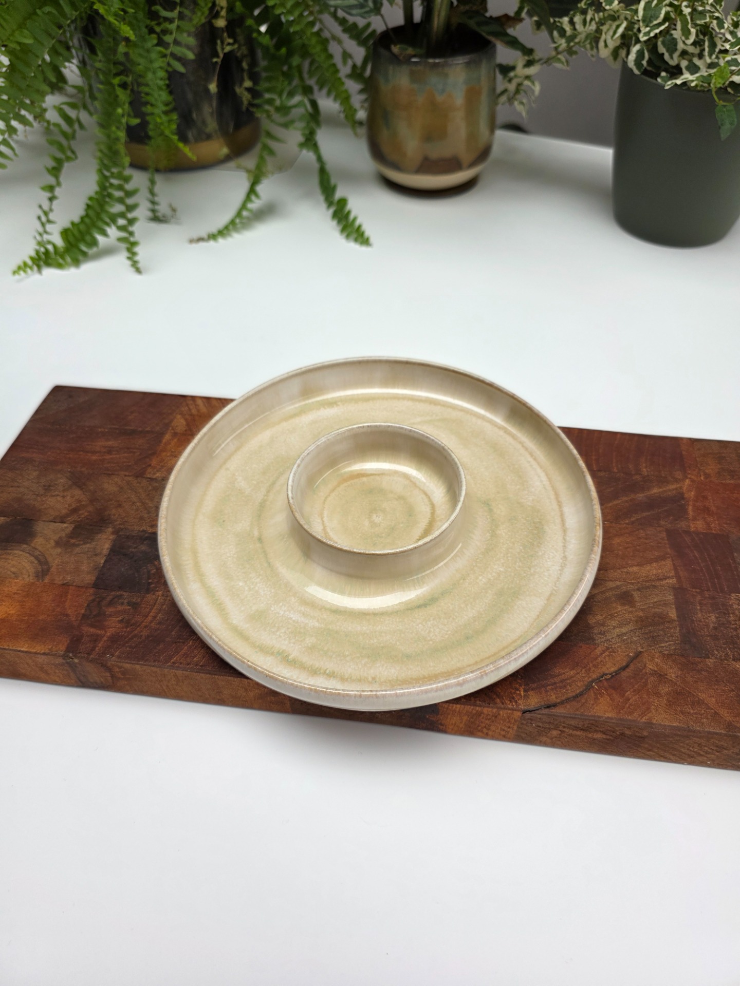 Handgedraaid, middelgroot aperobord in het sage mist glazuur op witbakkende klei. Een item dat multifunctioneel tijdens aperomomenten gebruikt kan worden.