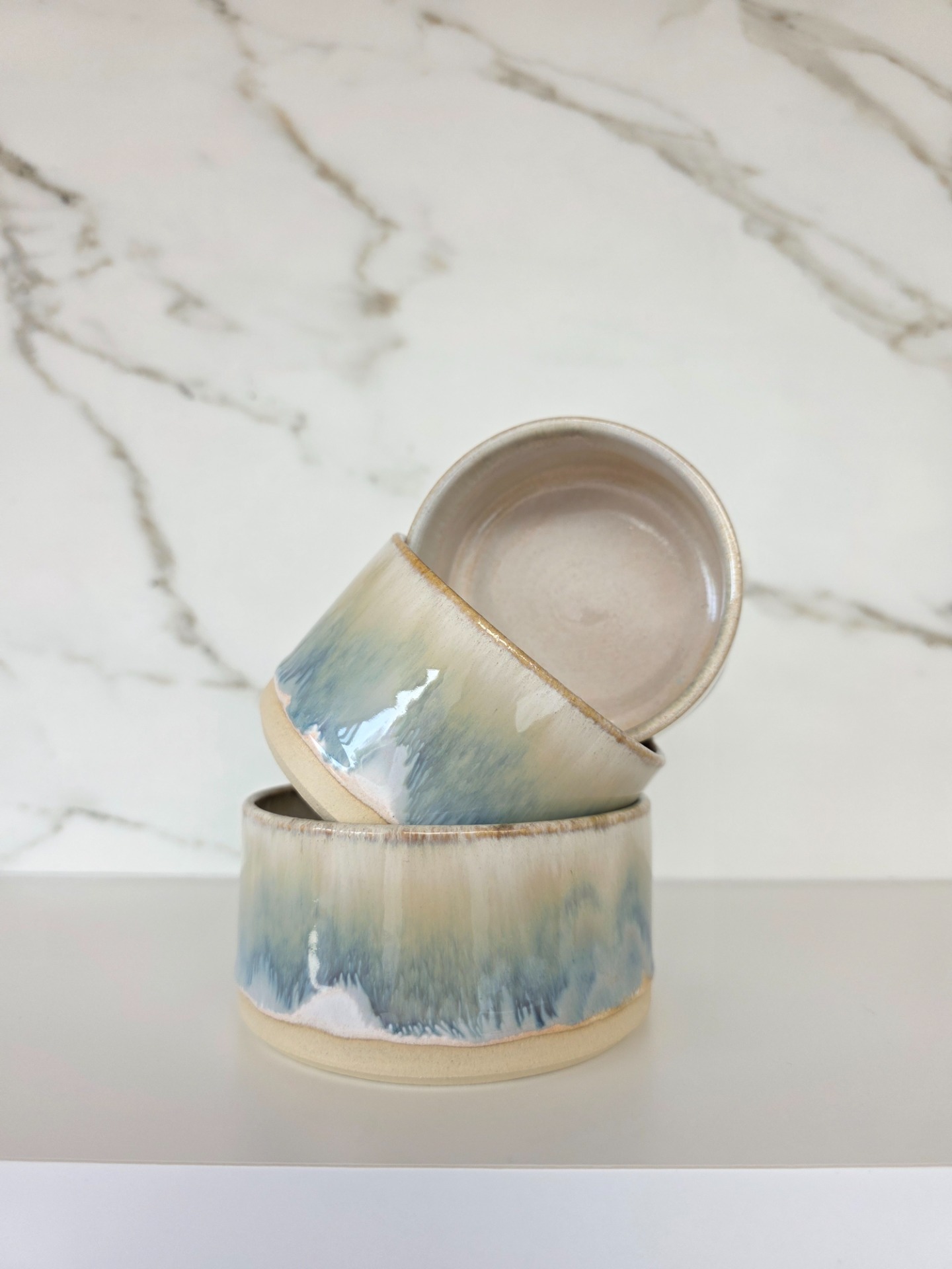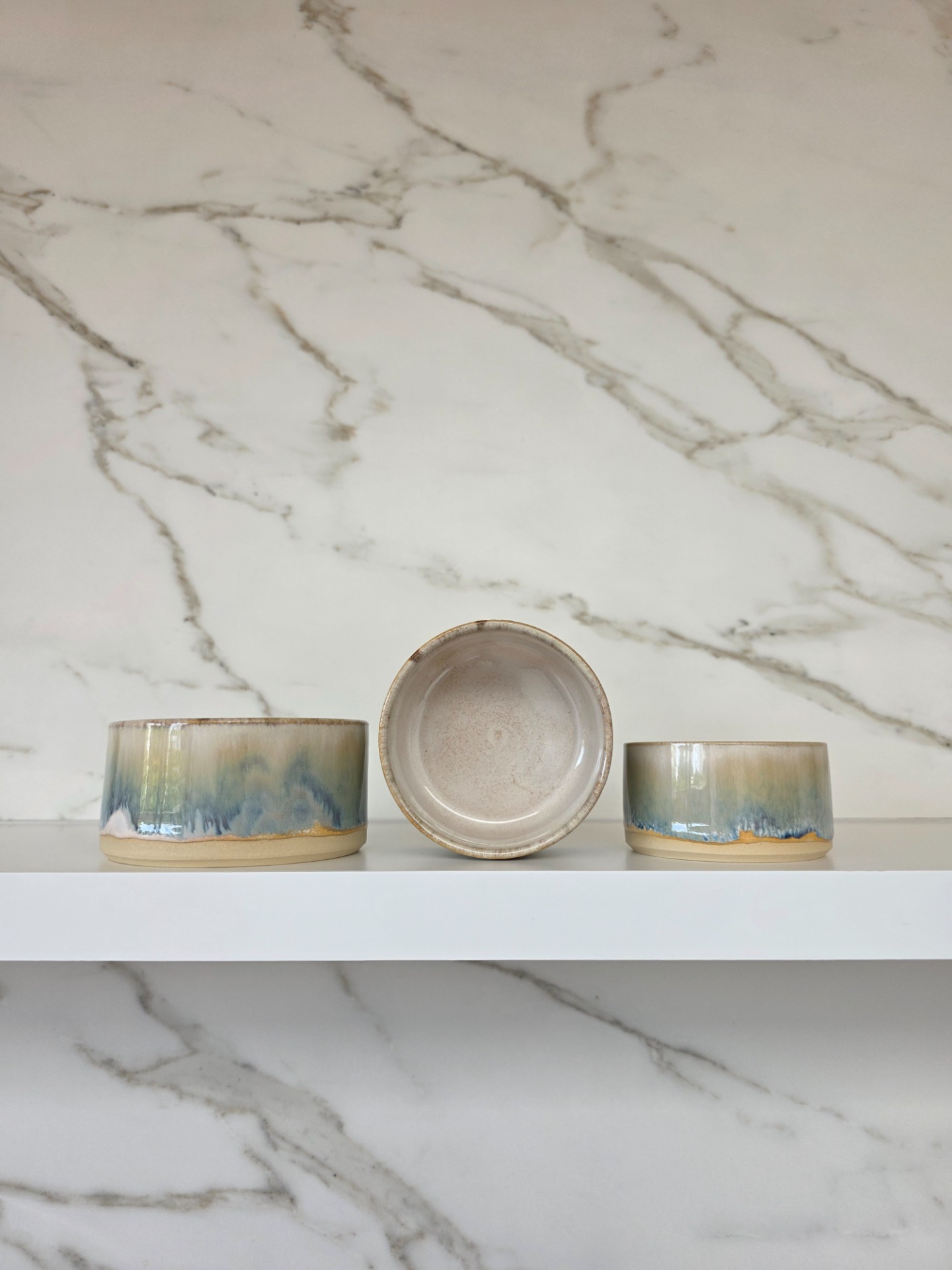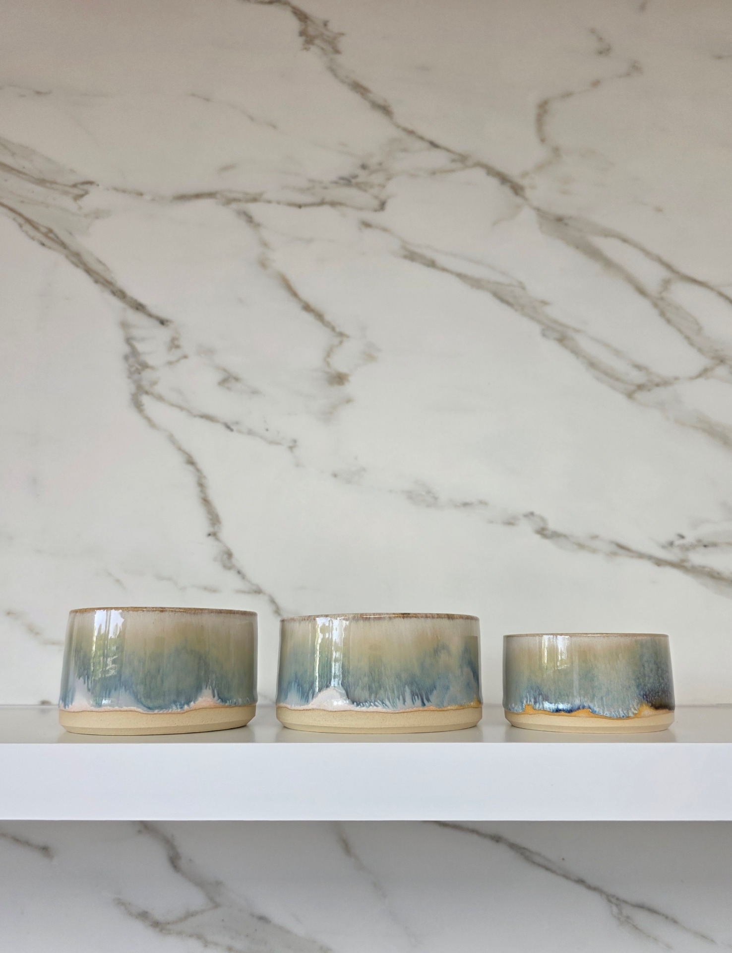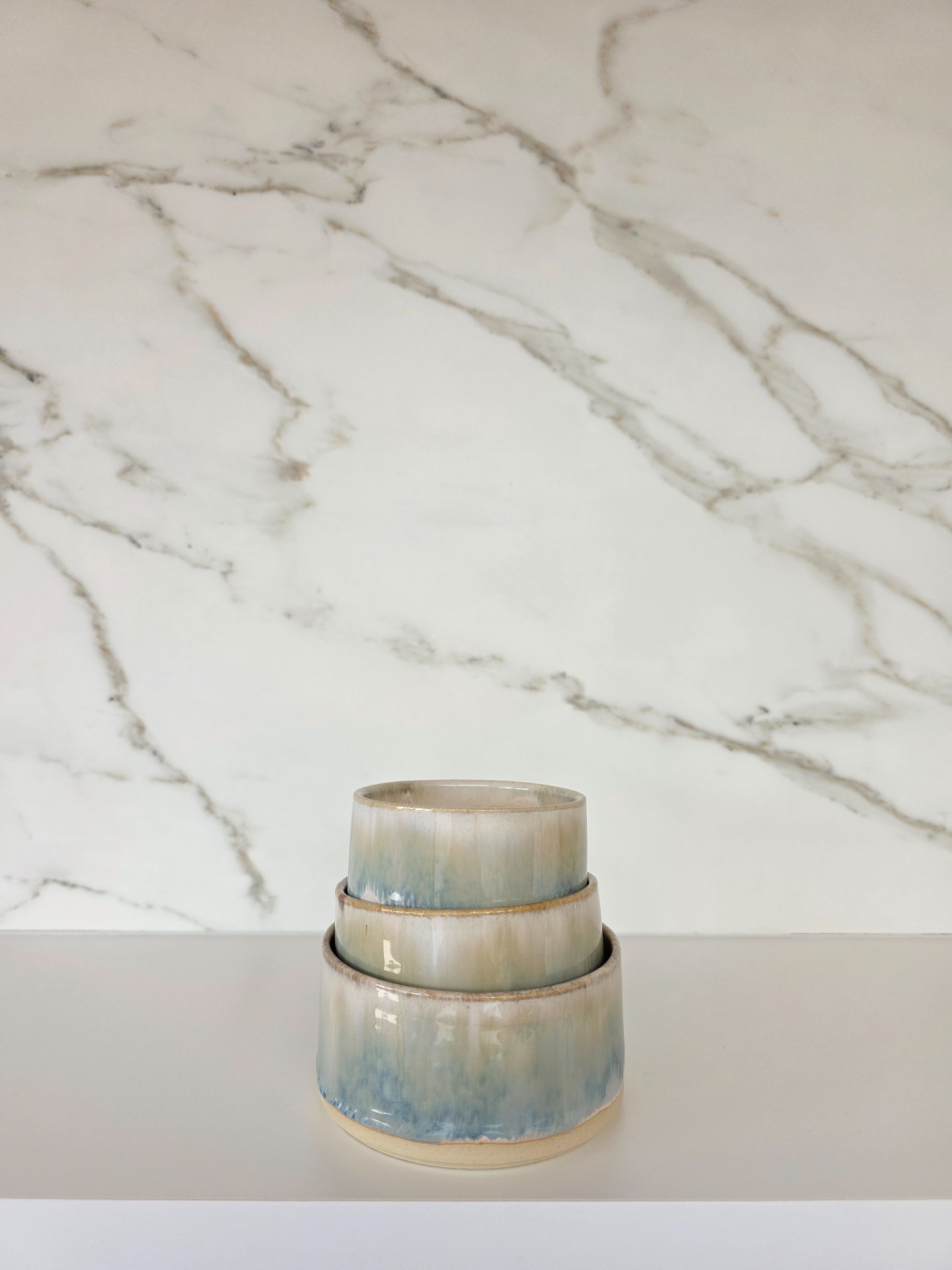Handgedraaide, 3-delige aperoset in het coastal glazuur op witbakkende klei. Deze set bestaat uit 3 verschillende, stapelbare formaten en kan multifunctioneel ingezet worden.