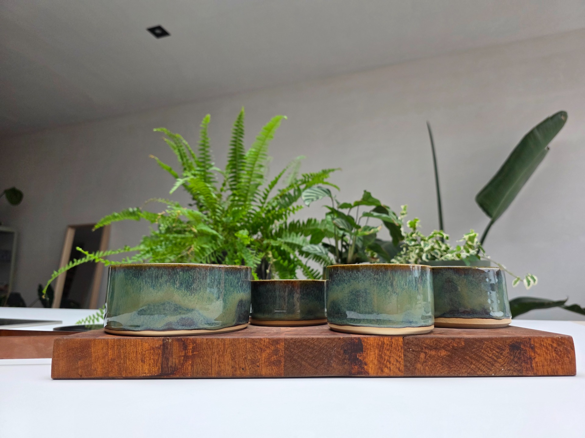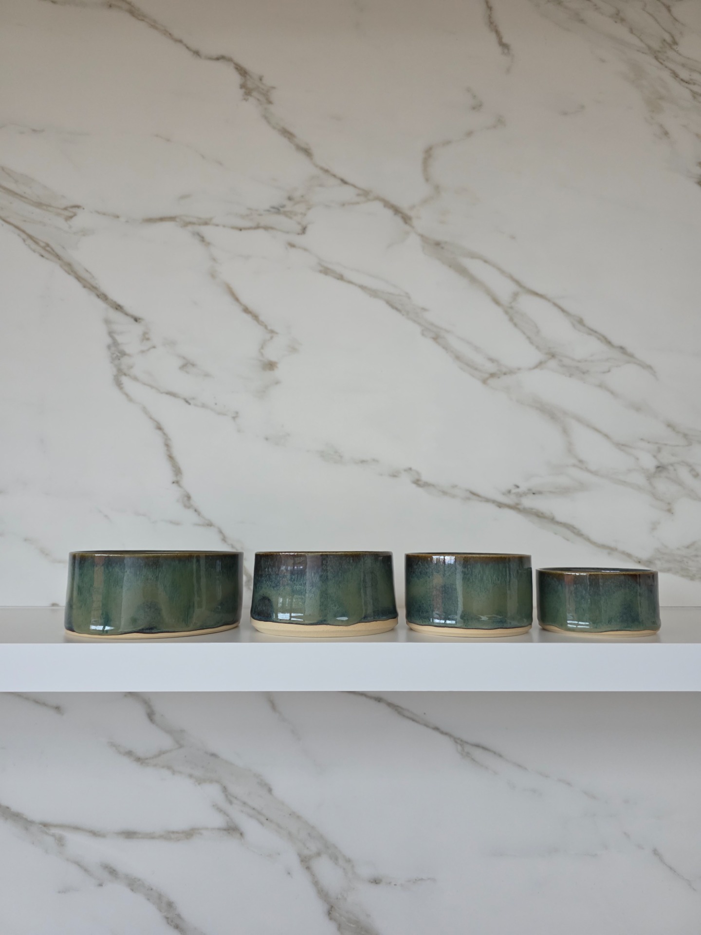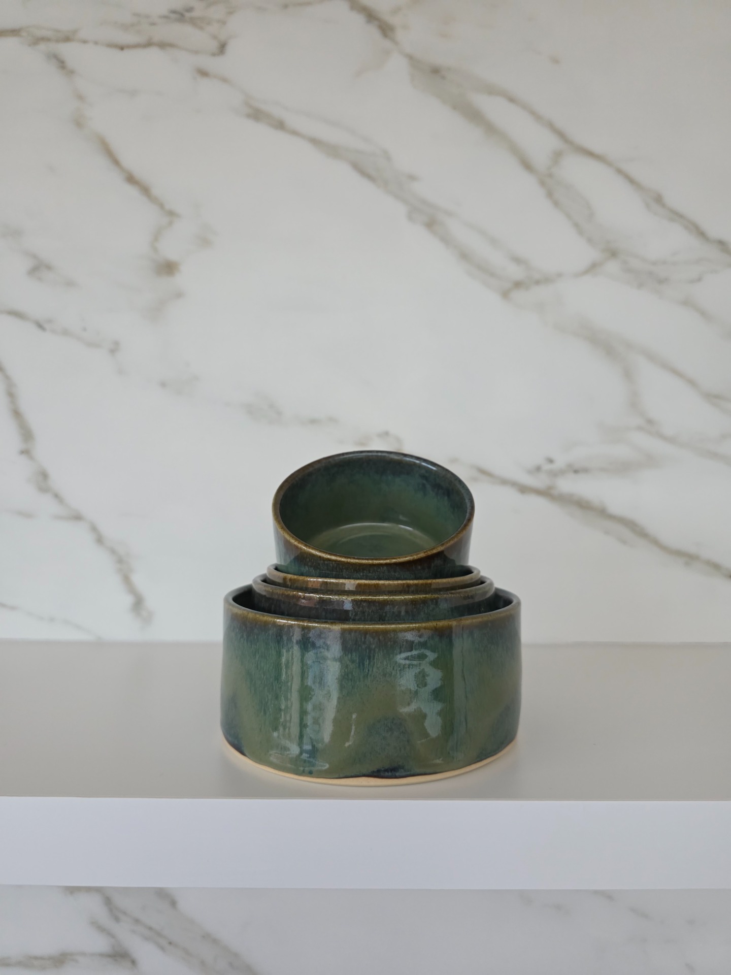 Handgedraaide, 4-delige aperoset in het mystic garden glazuur op witbakkende klei. Deze set bestaat uit 4 verschillende, stapelbare formaten en kan multifunctioneel ingezet worden.