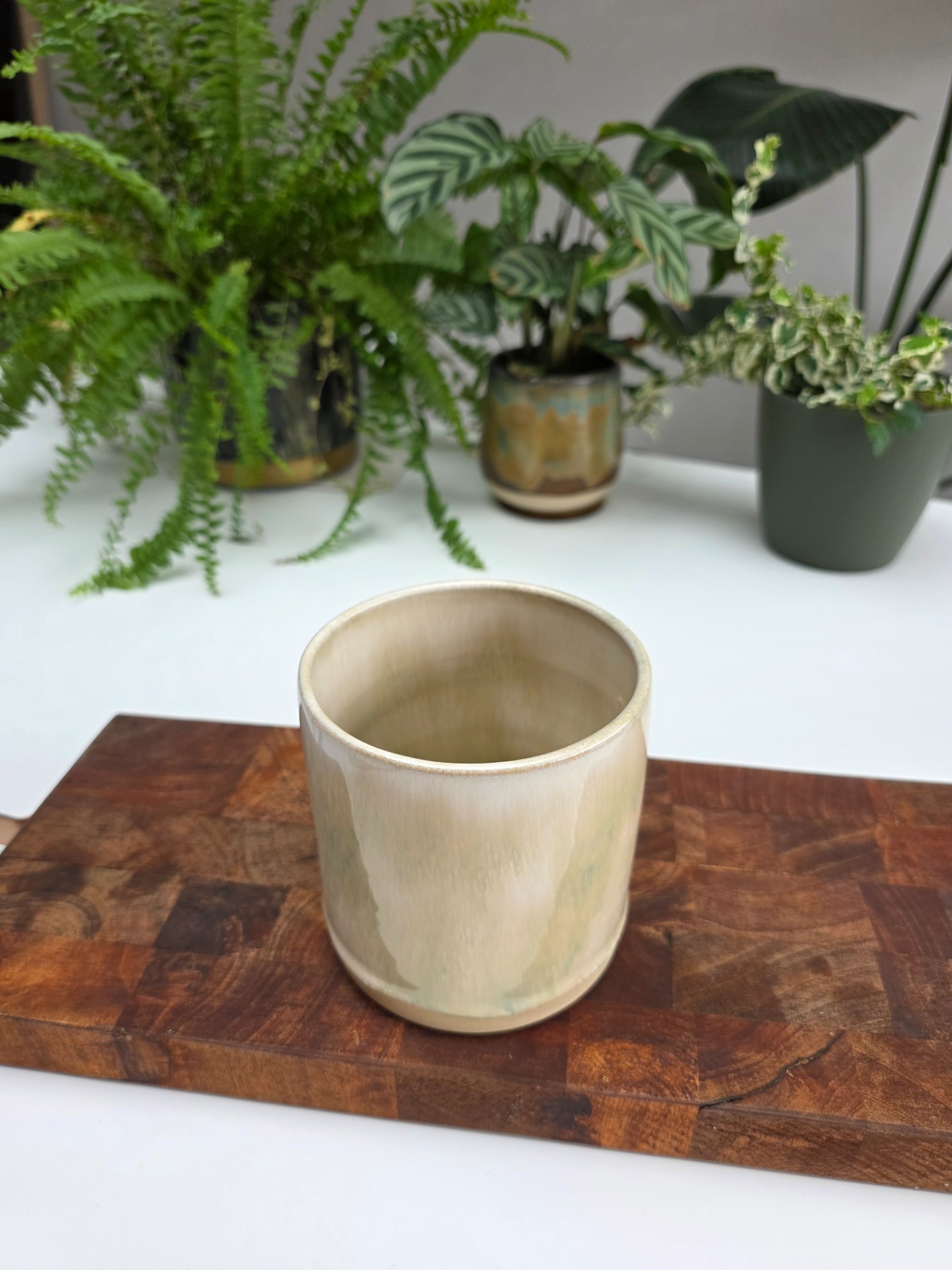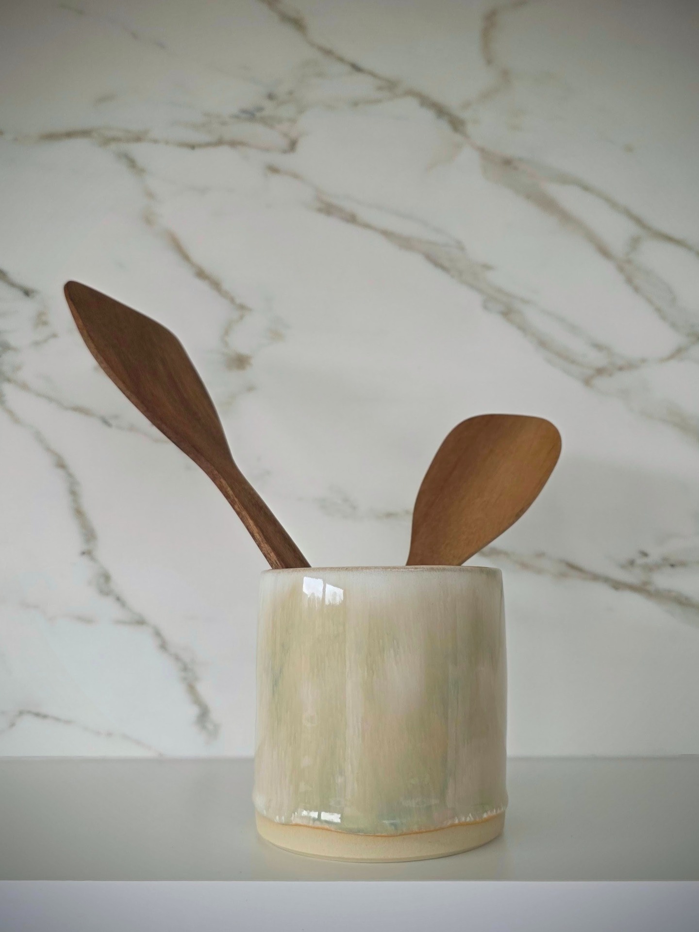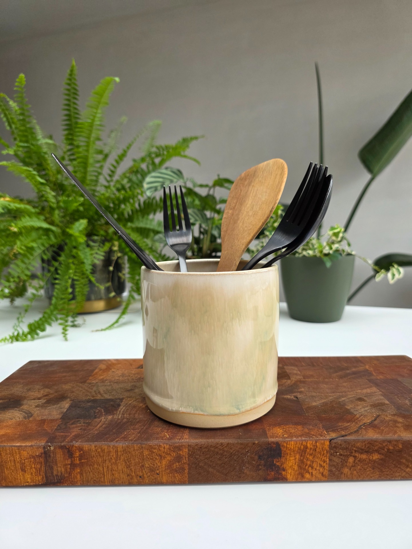 Handgedraaide bestekpot in het sage mist glazuur op witbakkende klei.