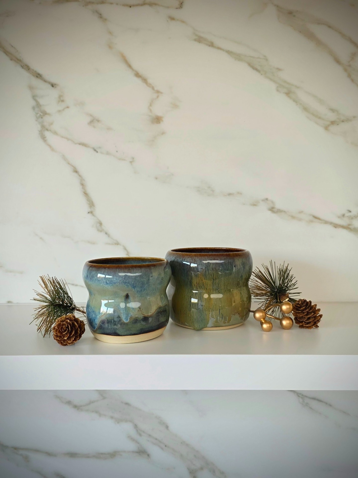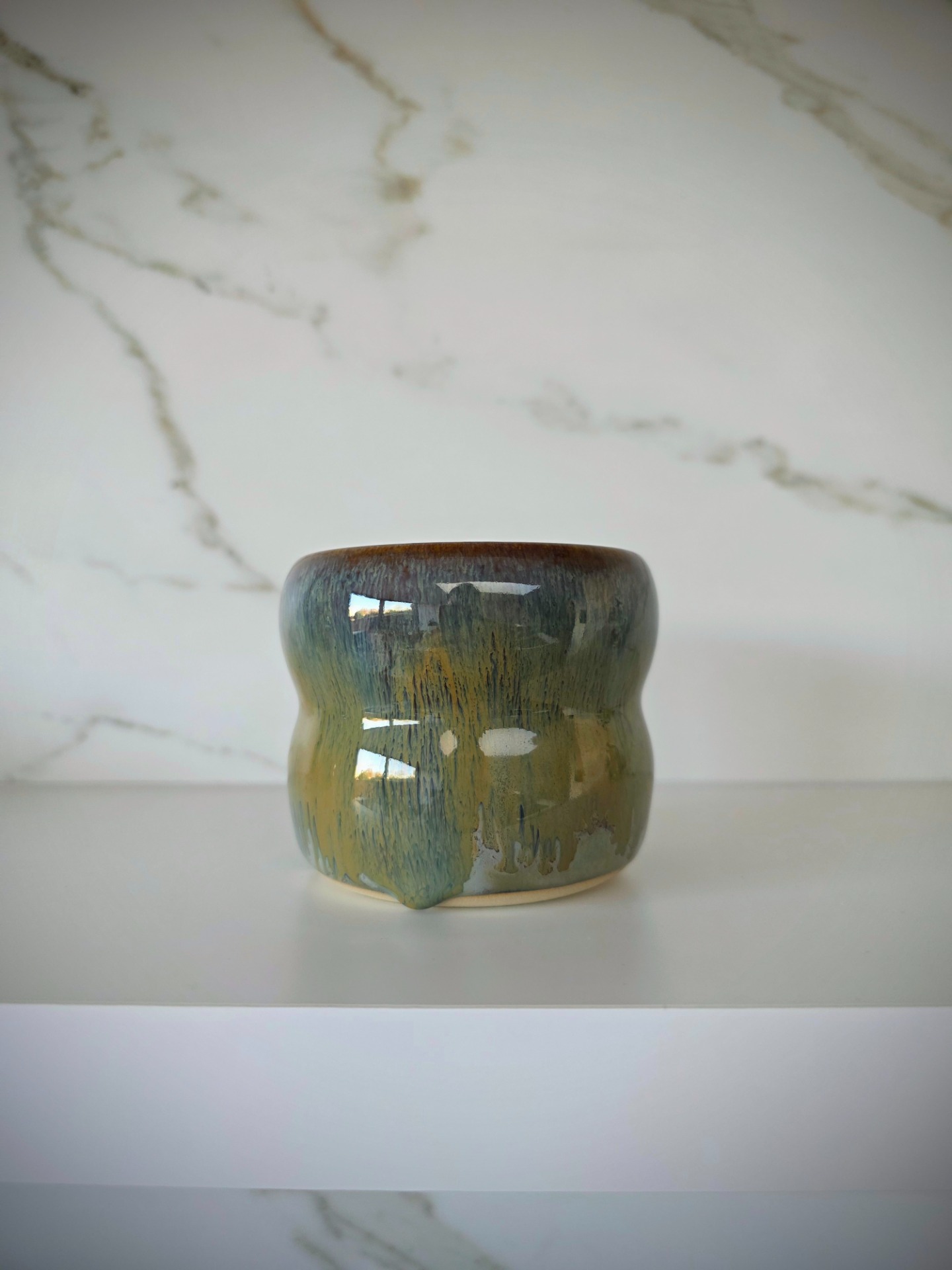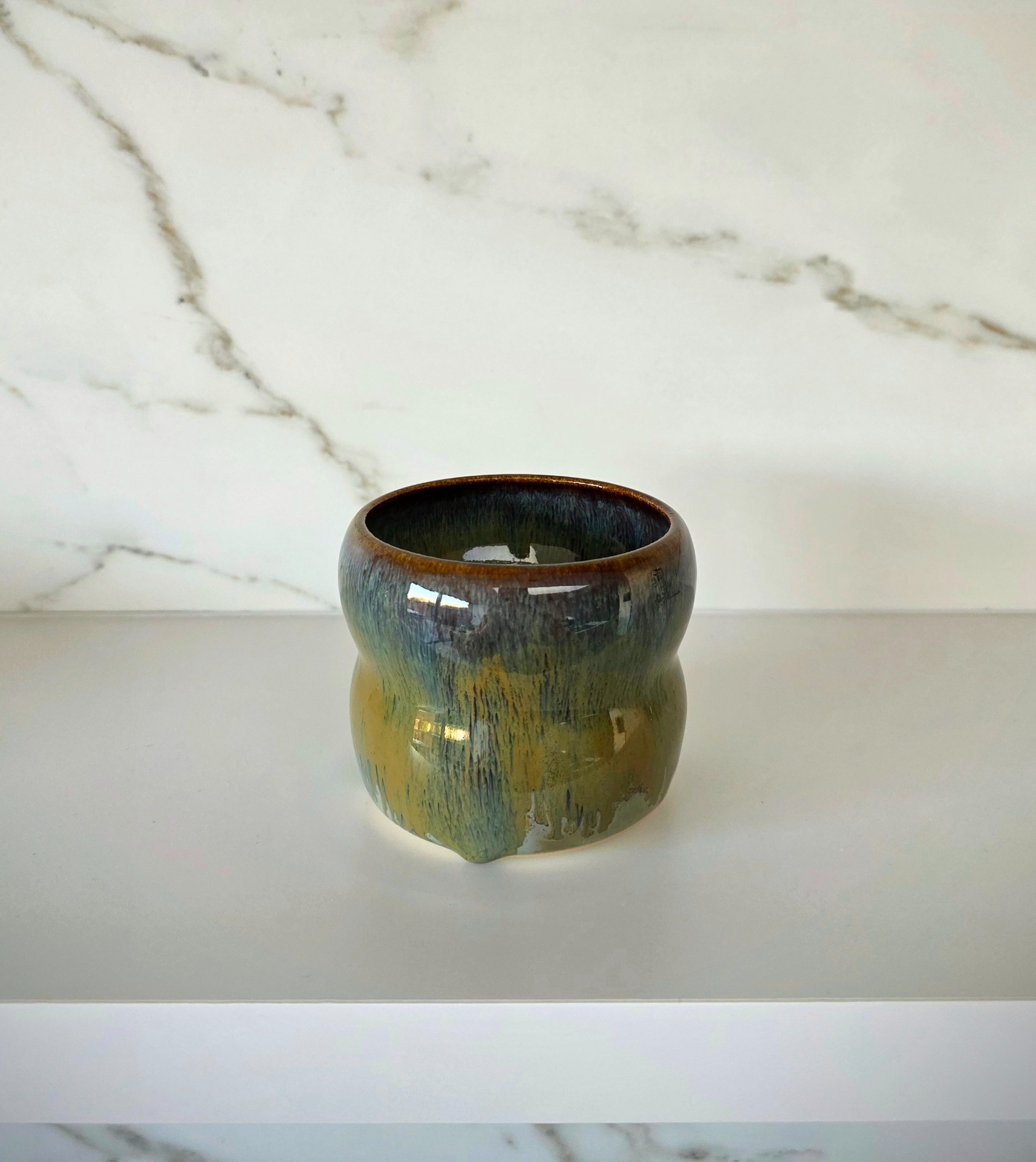 Keramische bubbeltas gemaakt van witbakkende klei en afgewerkt met een blauwbruine glazuurcombinatie.