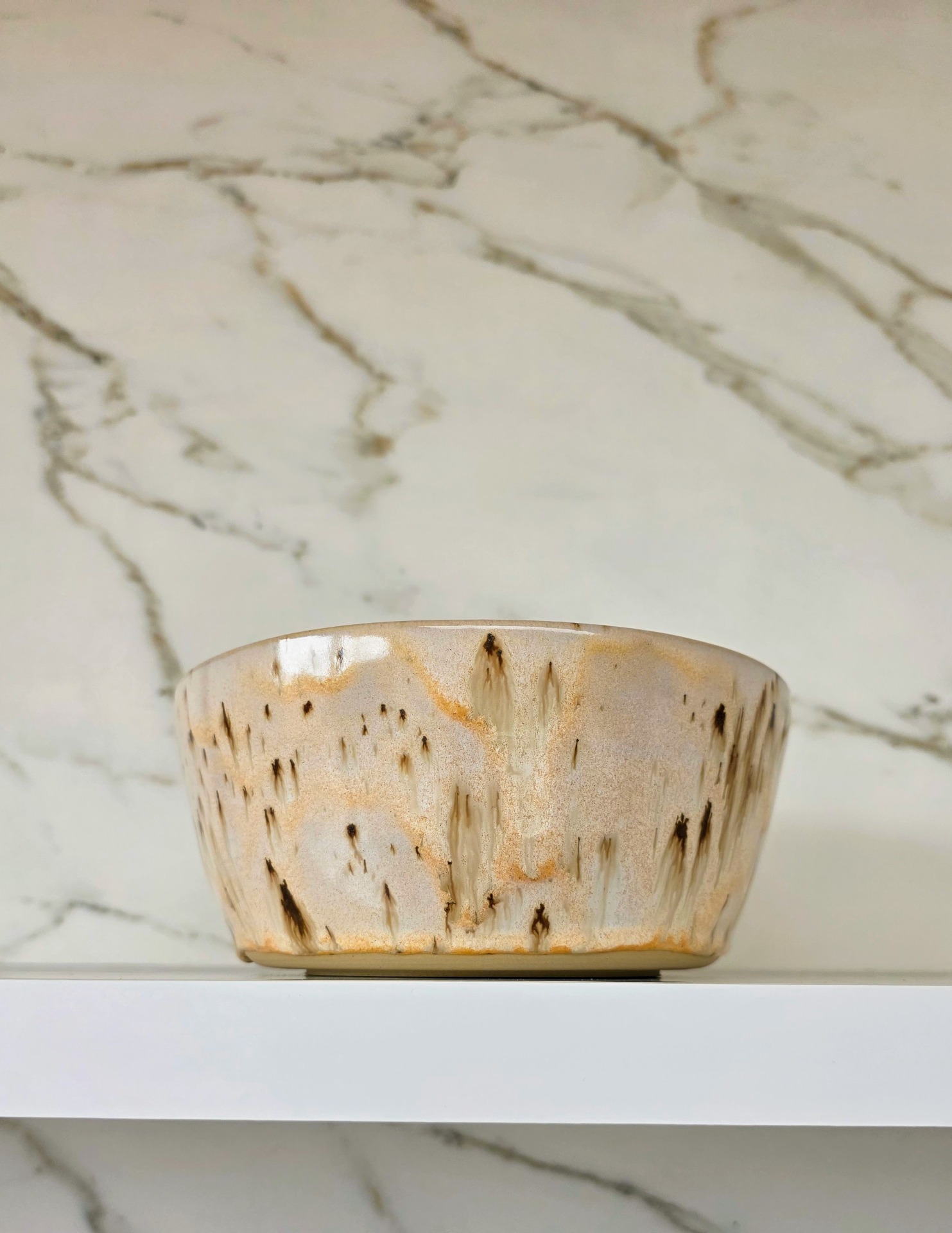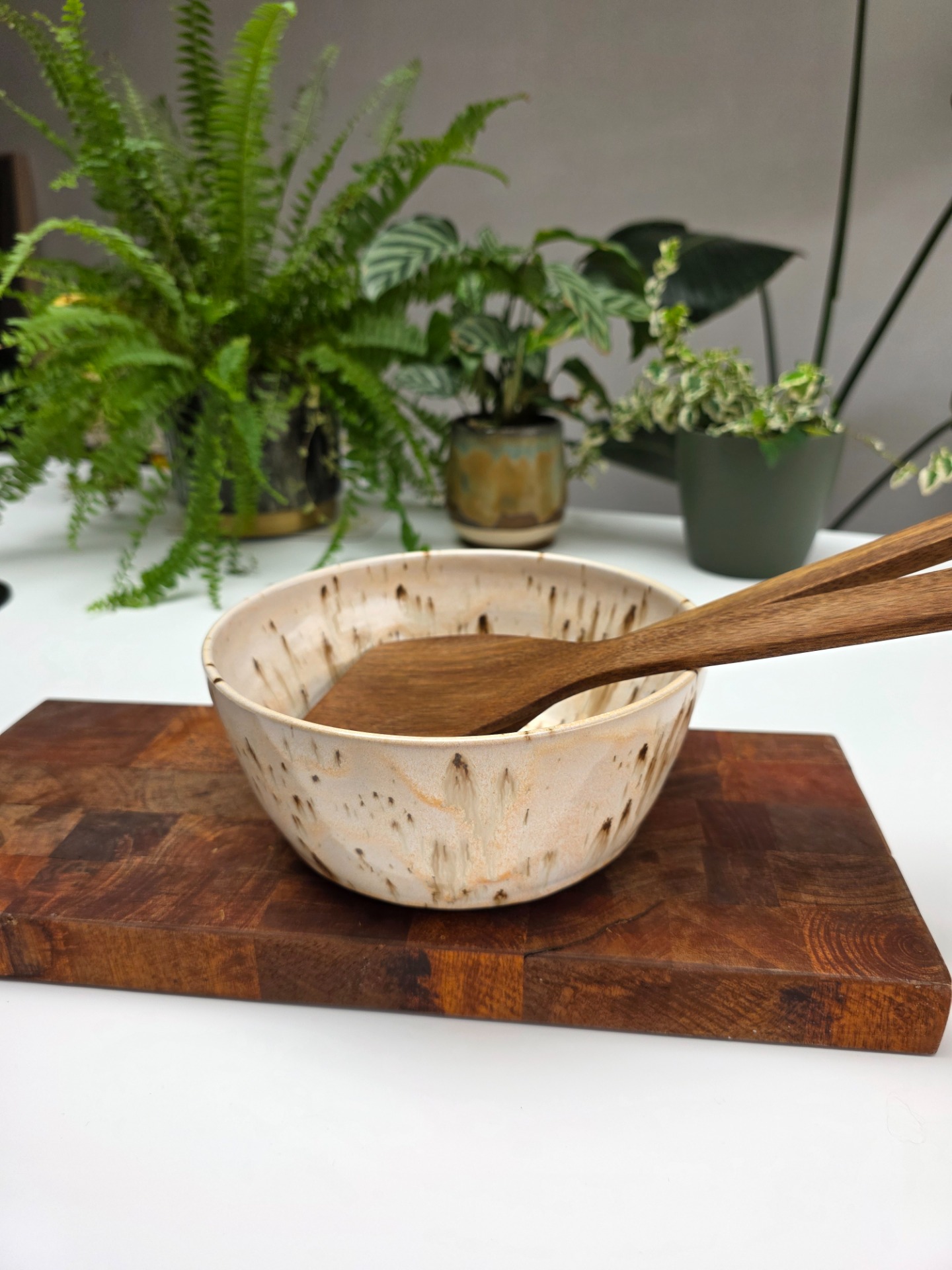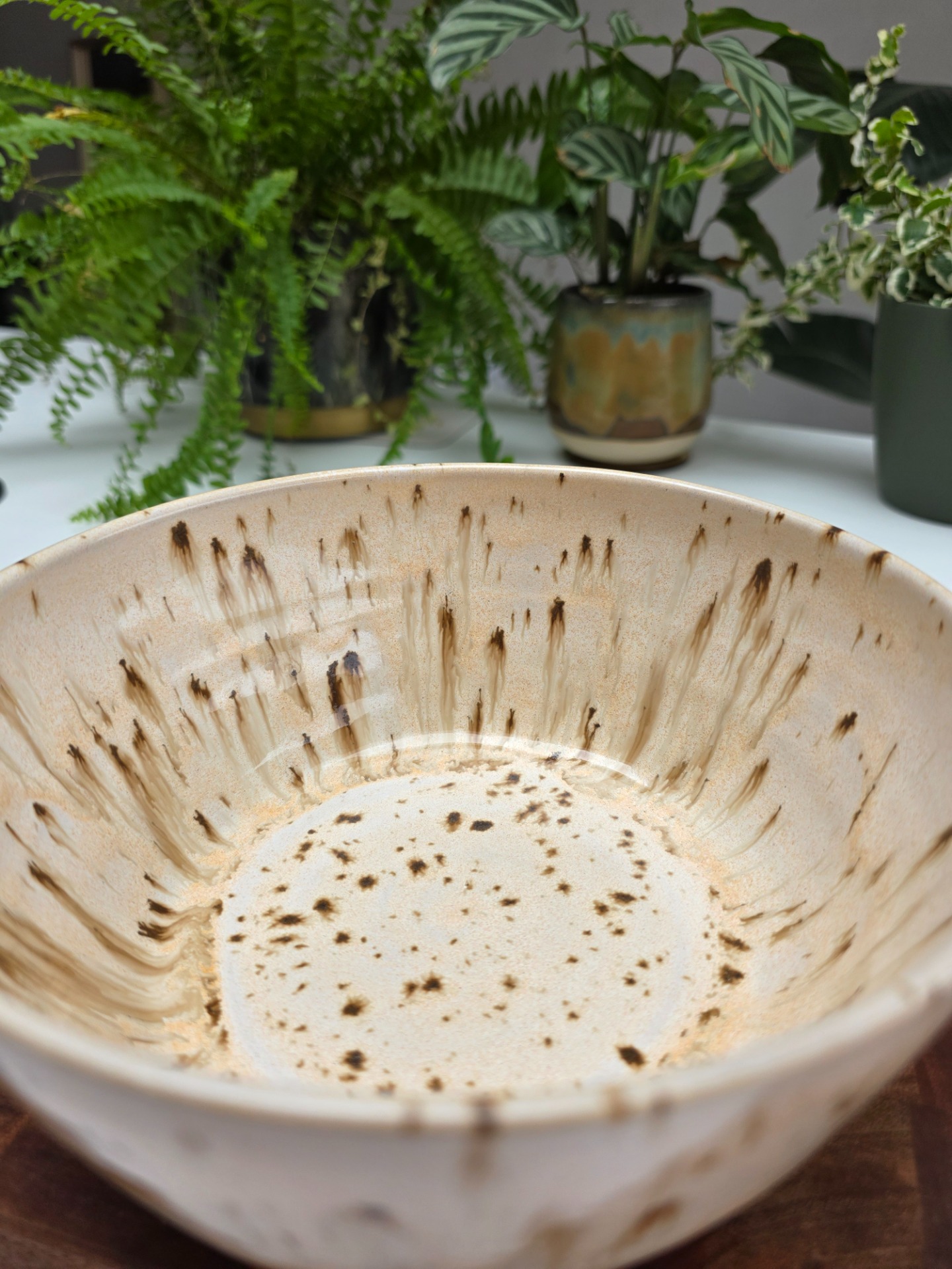 Handgedraaide, grote kom in het wild ash glazuur op witbakkende klei. Deze kom is multifunctioneel en kan onder andere gebruikt worden voor fruit, sla, ramen, etc.