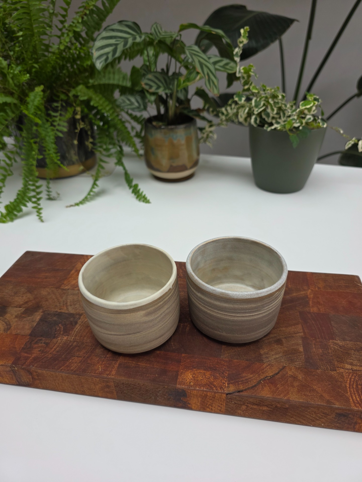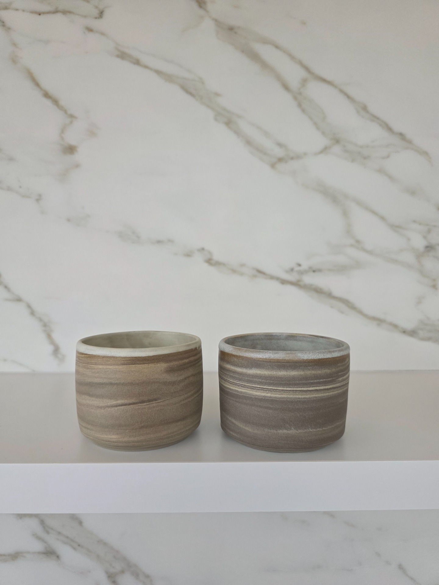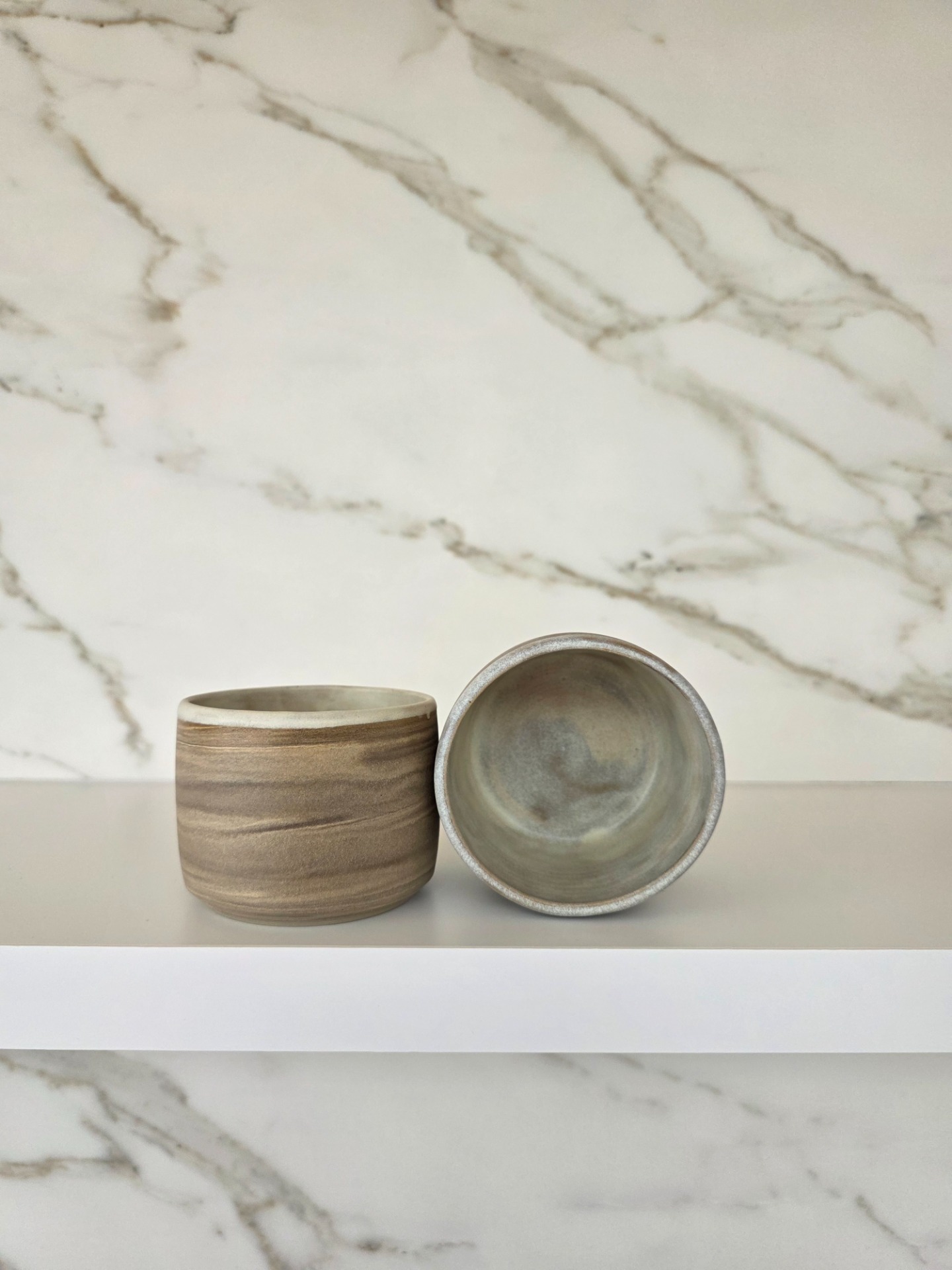 Handgedraaide koffietassen in marmerklei afgewerkt met een matwit glazuur aan de binnenkant. Er is momenteel een mogelijkheid tot een set van 2 tassen.