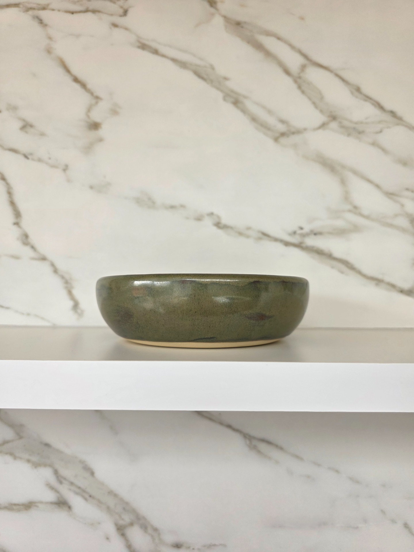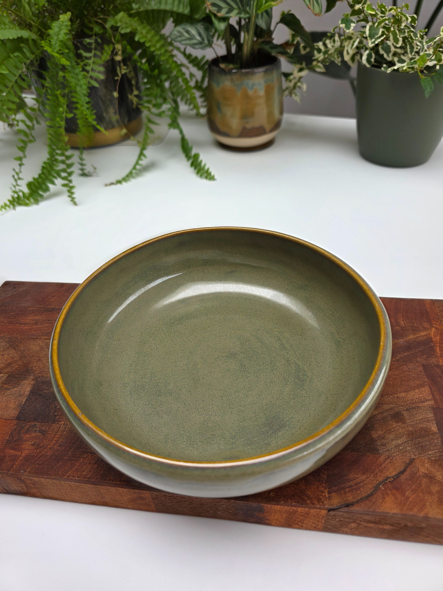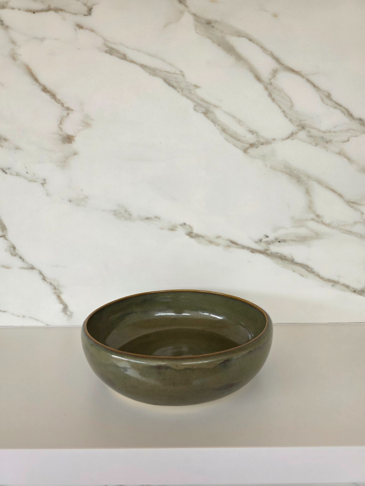 Handgedraaide, middelgrote kom in het olive drift glazuur op witbakkende klei. Deze kom is multifunctioneel en kan onder andere gebruikt worden voor ontbijt, voor- of kleine gerechten, bij de aperitief, pasta, etc.
