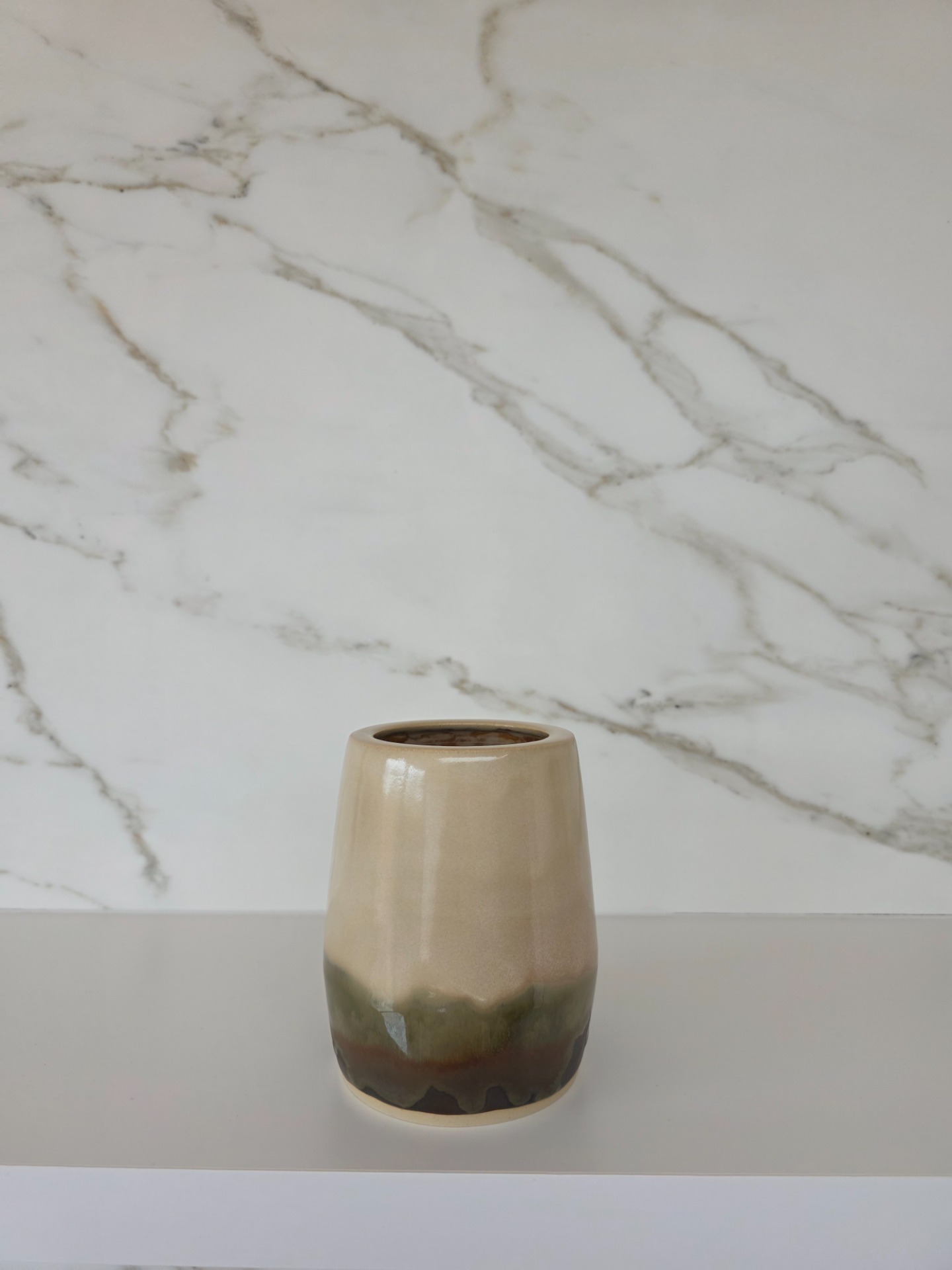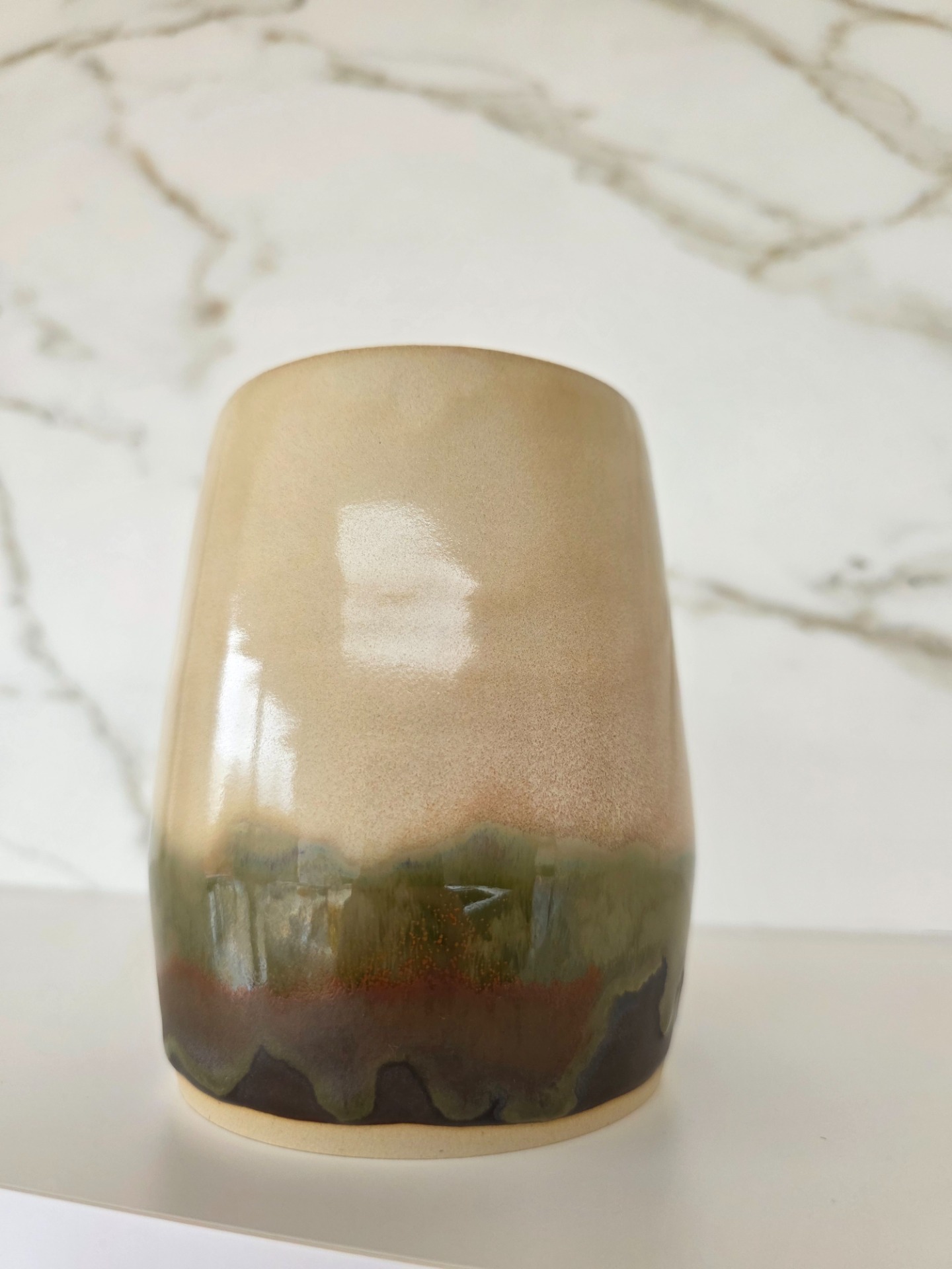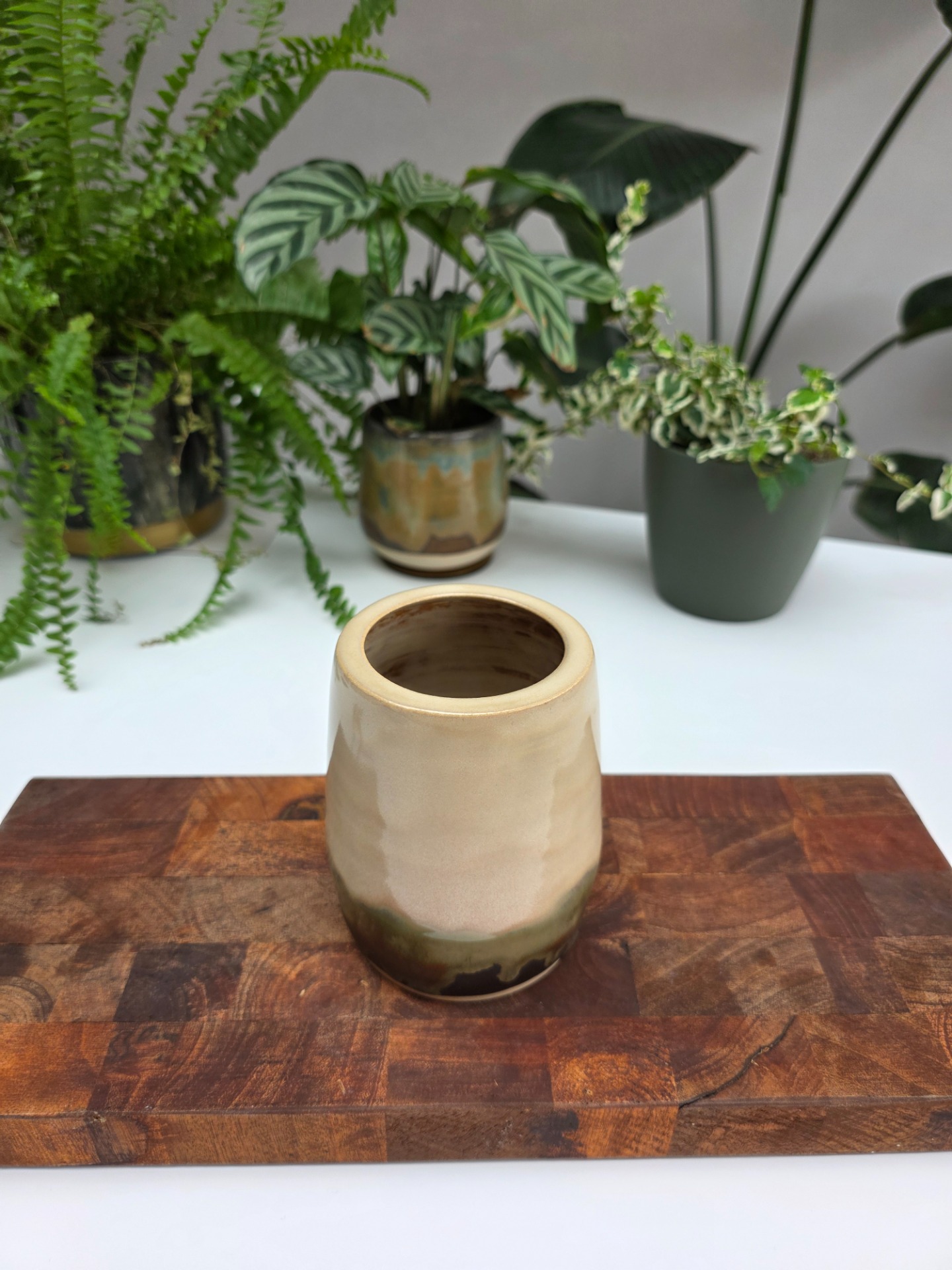 Handgedraaid minivaasje in het moss & clay glazuur op witbakkende klei.