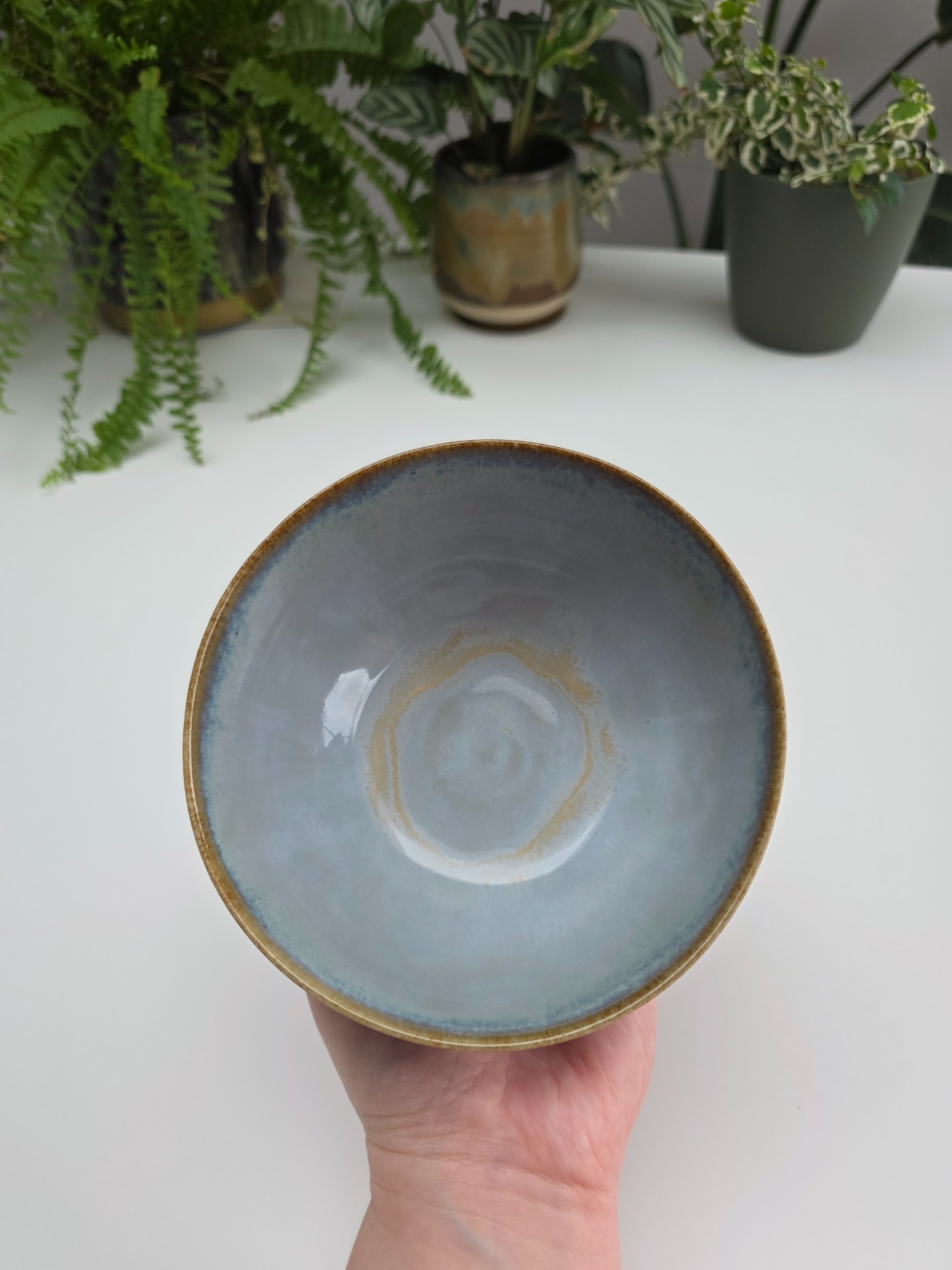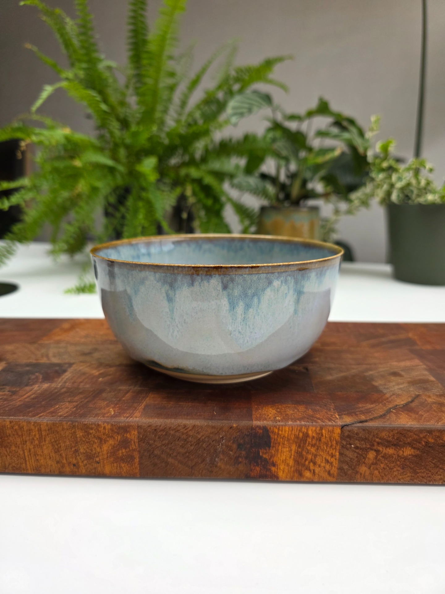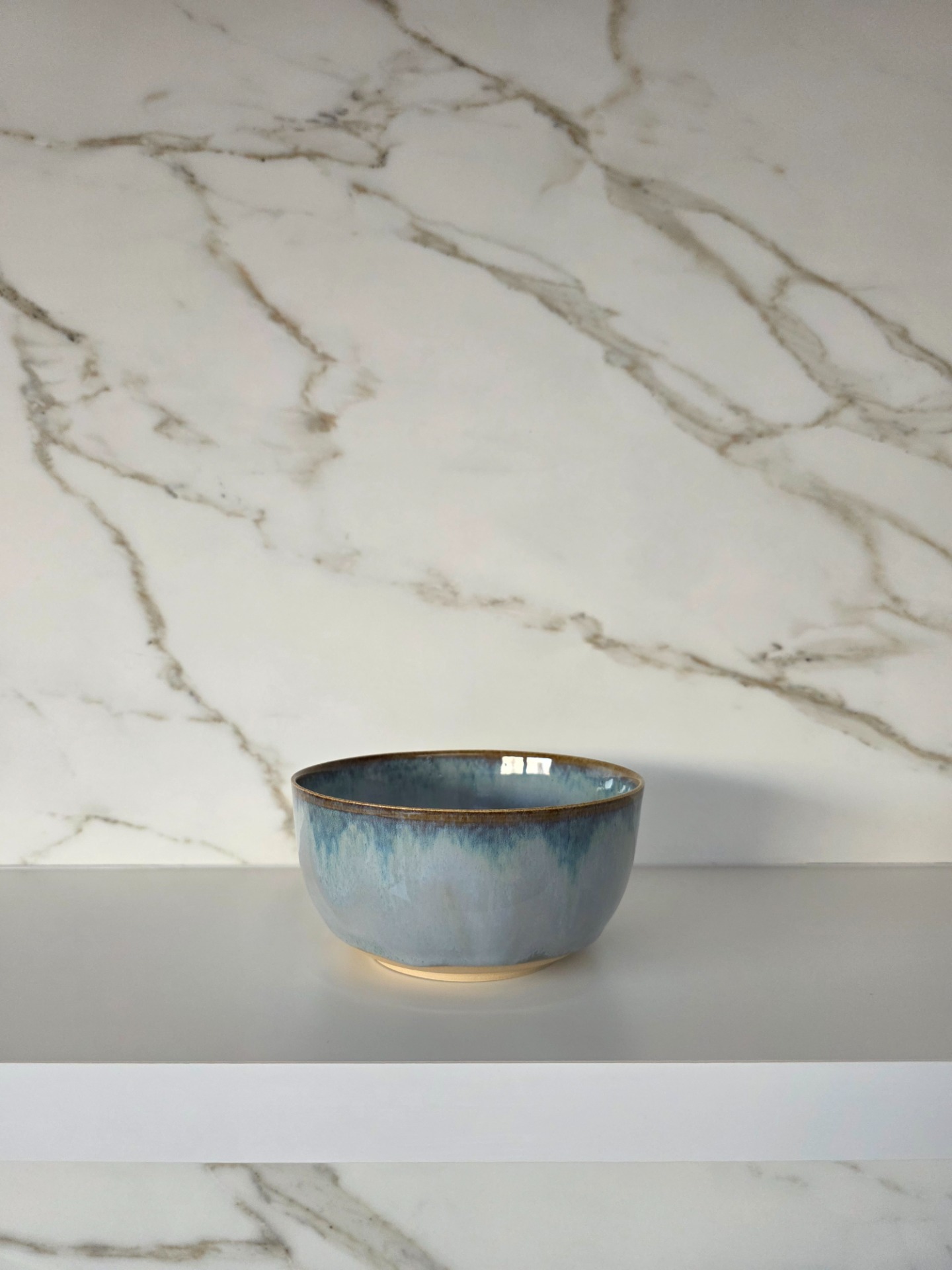 Handgedraaid ontbijtkommetje in het sea mist glazuur op witbakkende klei. Dit kommetje kan zeker ook voor andere zaken gebruikt worden.