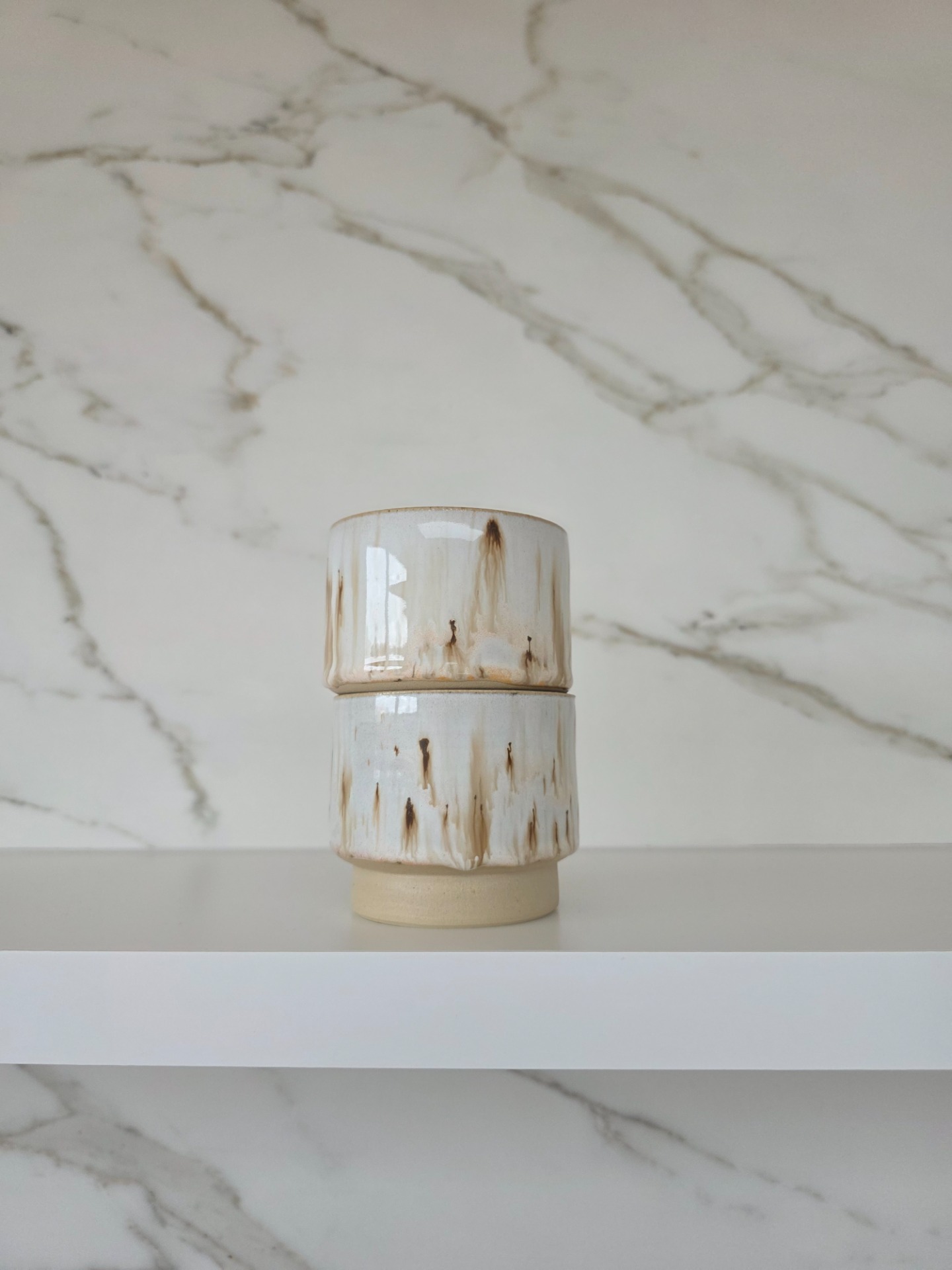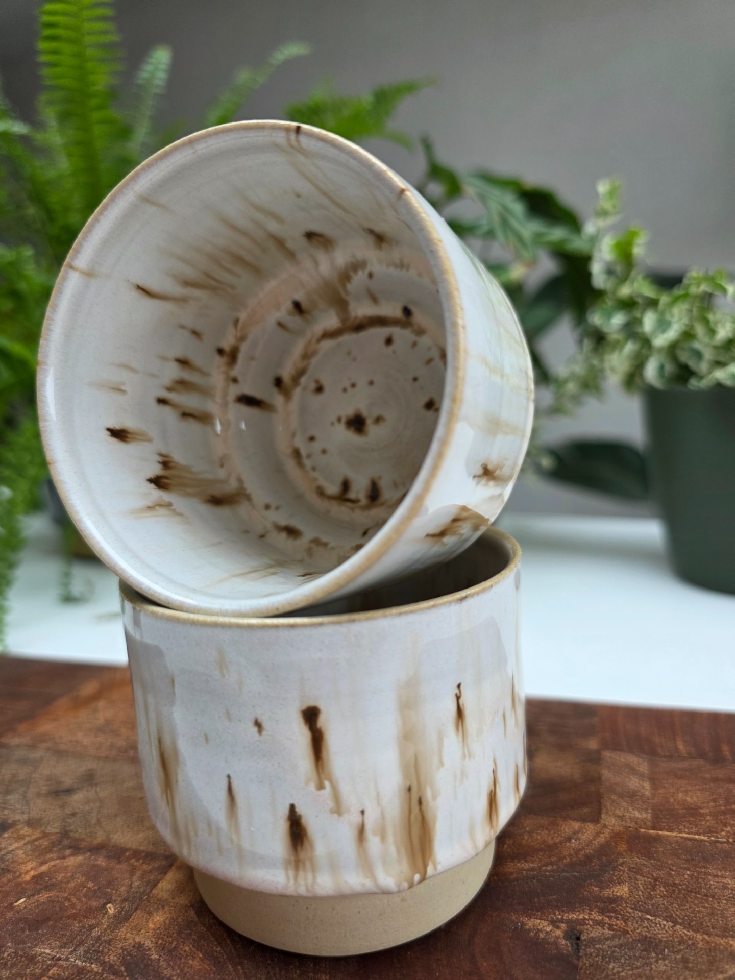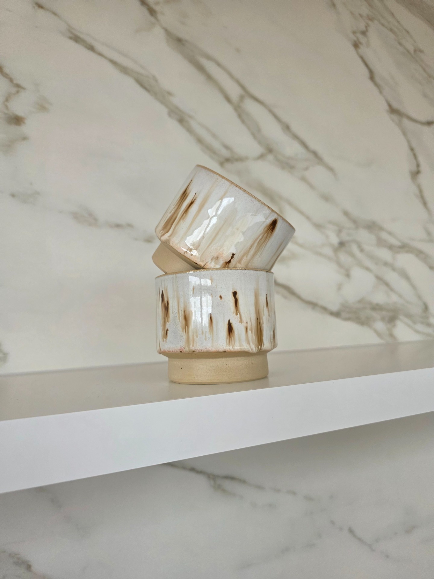 Set van 2 handgedraaide, stapelbare koffietassen in het wild ash glazuur op witbakkende klei.
