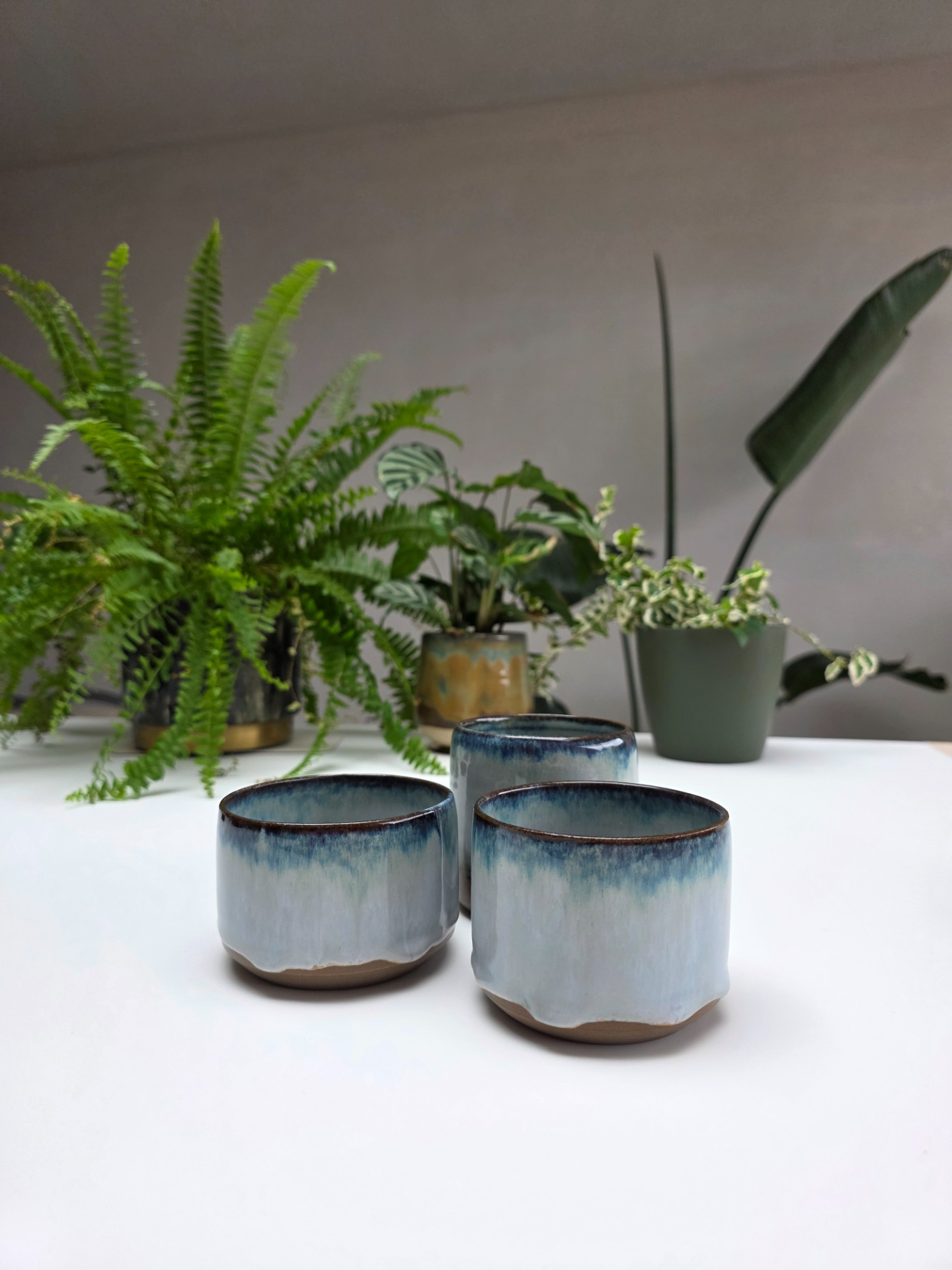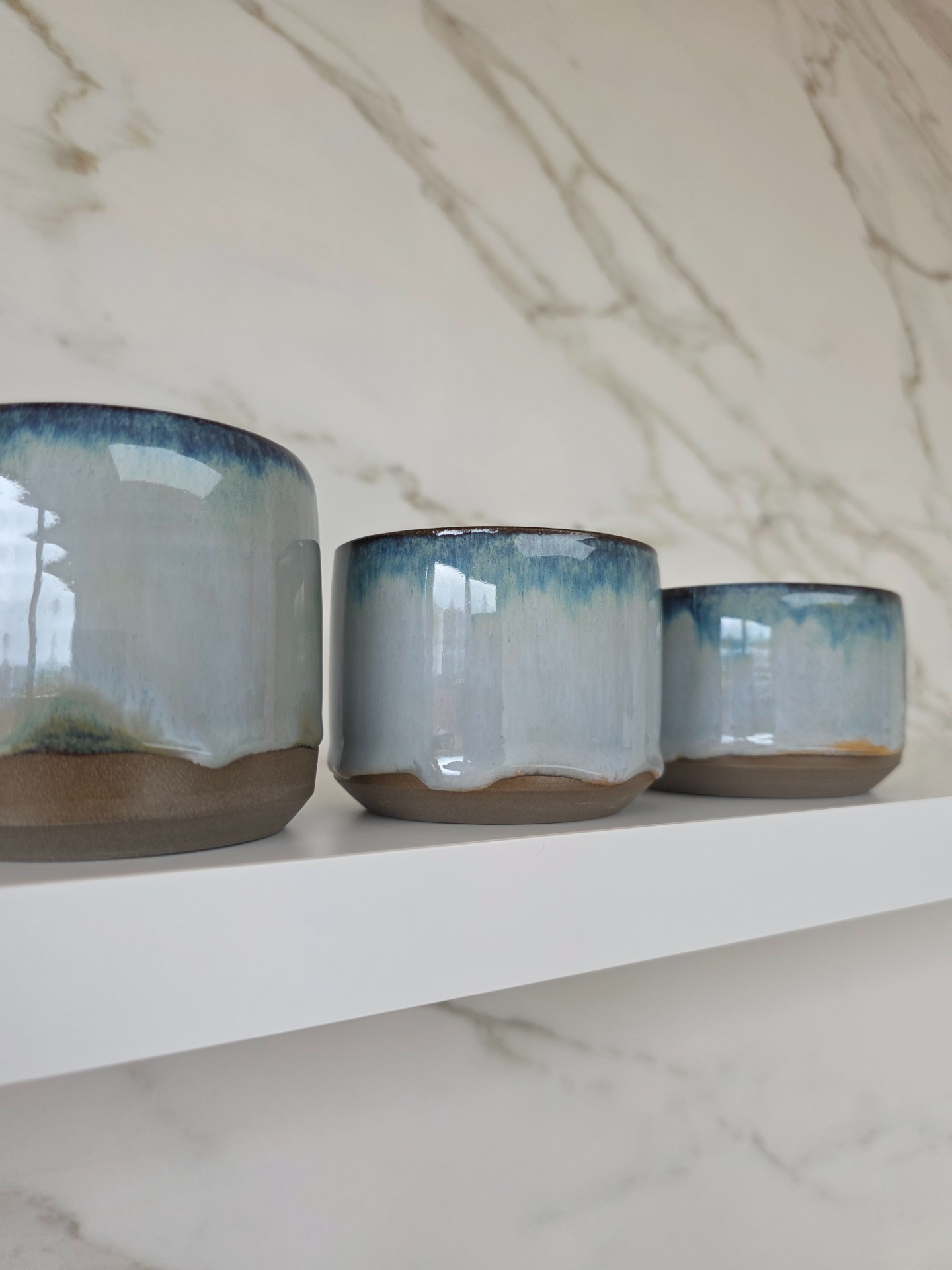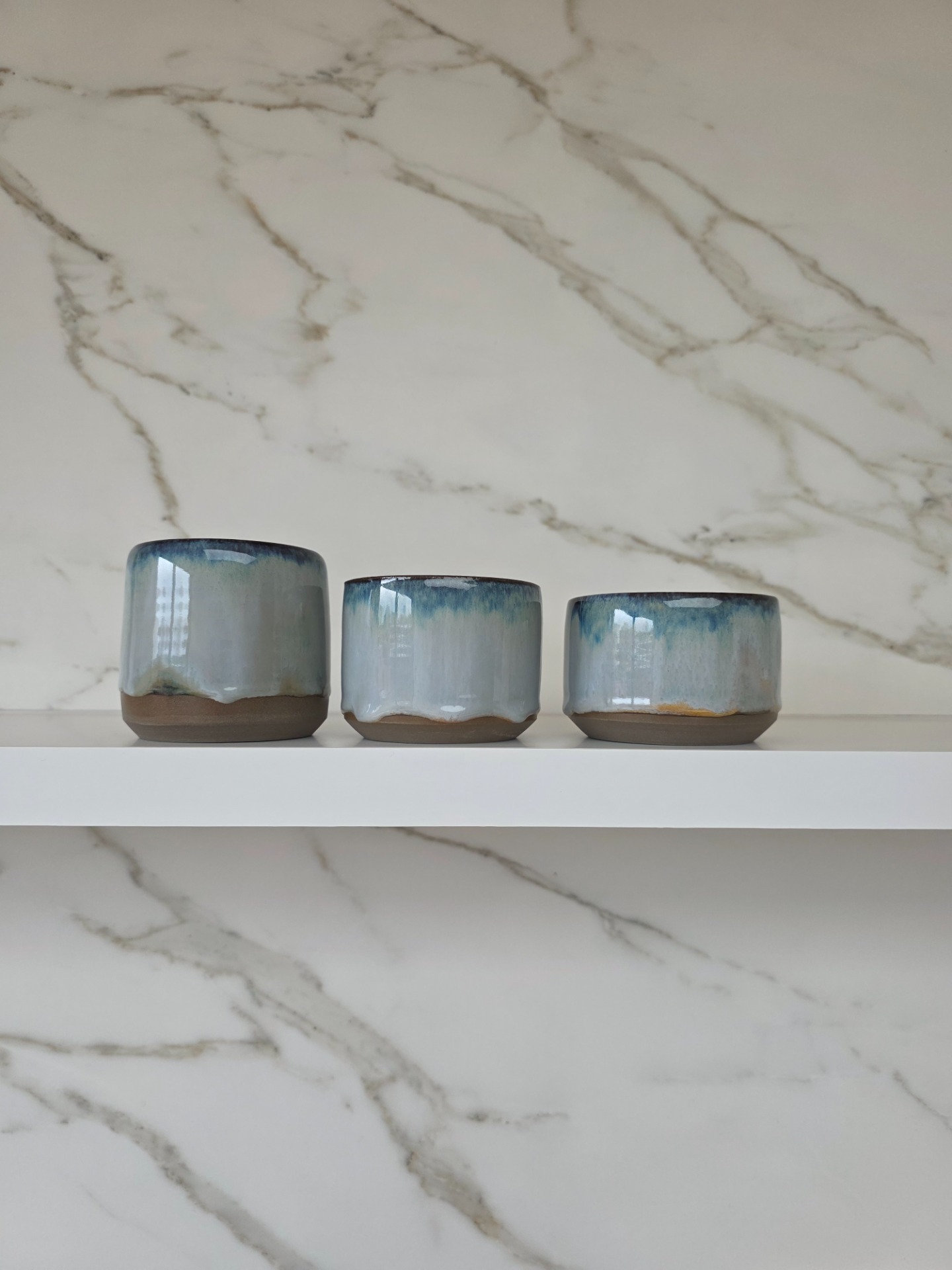 Set van 3 handgedraaide koffietassen in het sea mist glazuur op antracietbakkende klei. De tassen hebben verschillende formaten en inhoud.