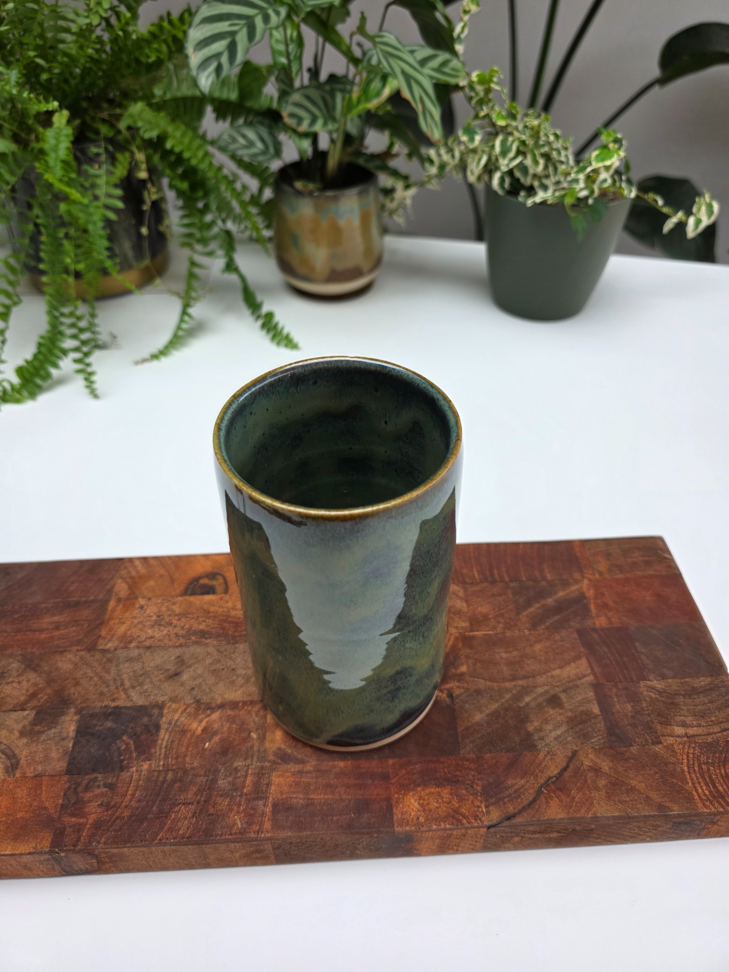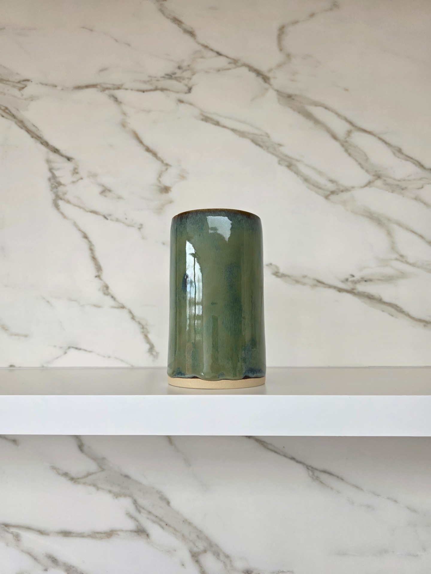 Handgedraaide vaas in het mystic garden glazuur op witbakkende klei.